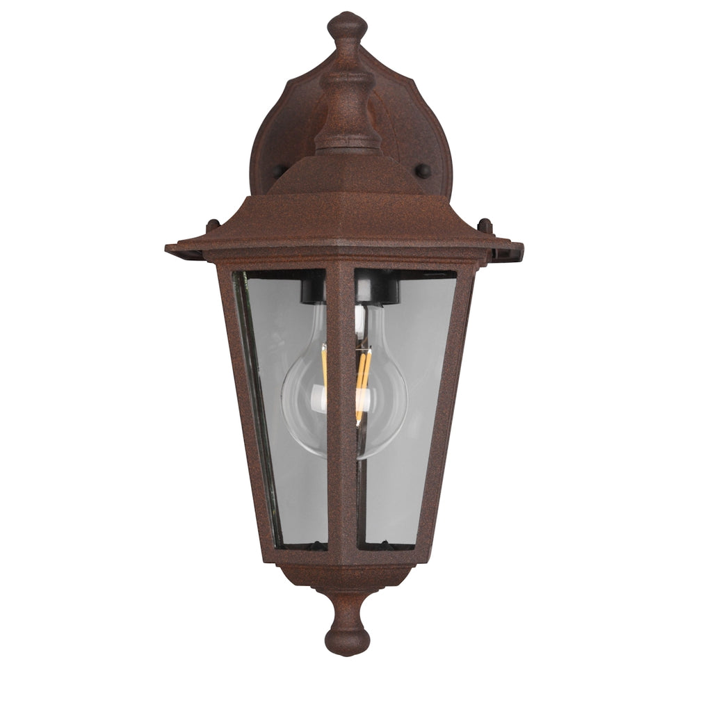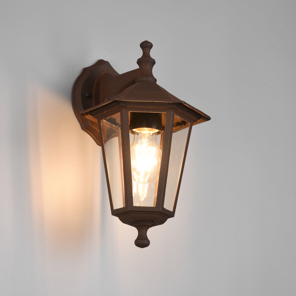 Applique da esterno in alluminio finitura ruggine antichizzata con lanterna esagonale discendente e vetri trasparenti. Altezza 51 cm, IP44. Attacco E27 per lampadina LED o alogena (non inclusa). Design classico e resistente, ideale per facciate, terrazzi e porticati.