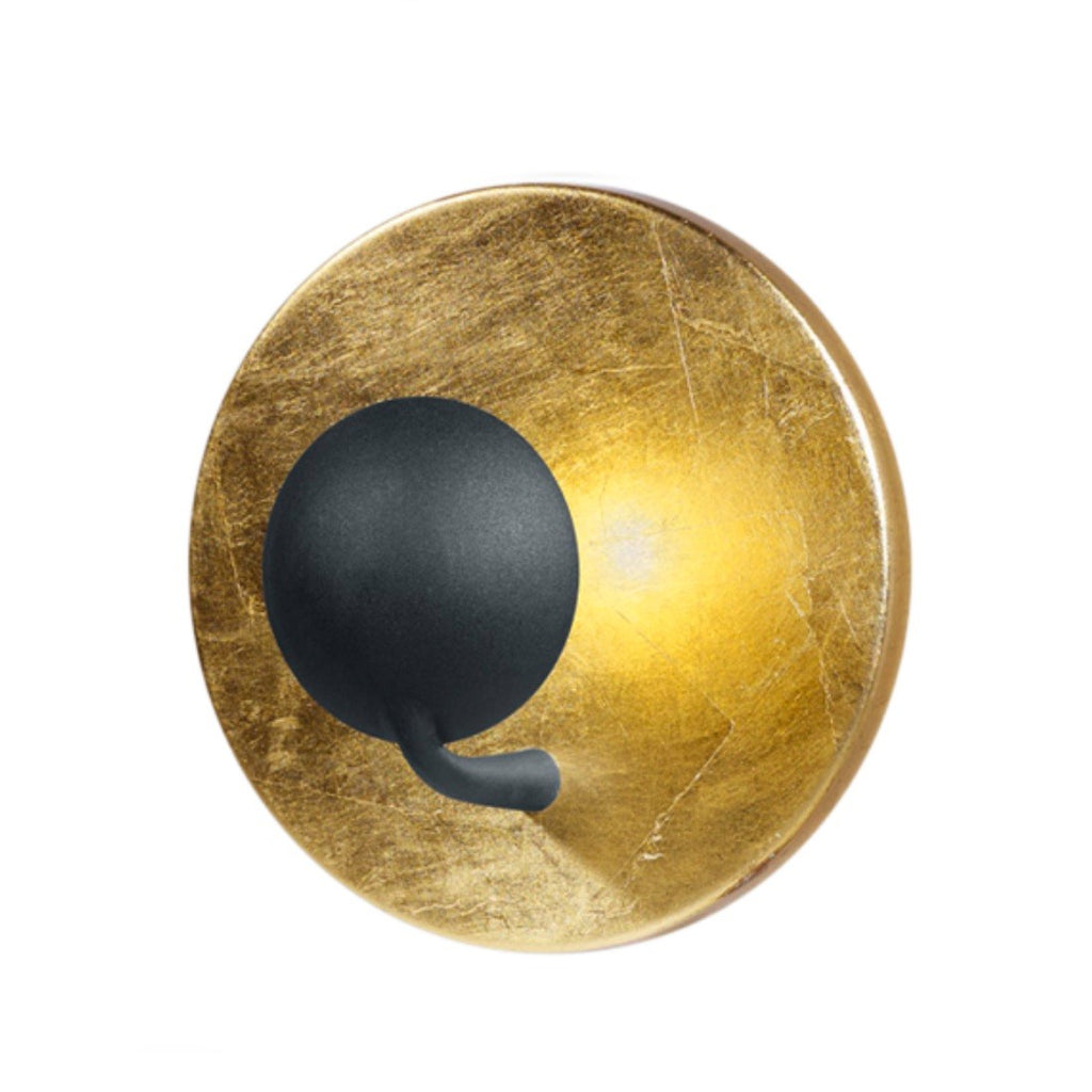 Applique moderna ad illuminazione indiretta e riflessa, forma tonda in metallo nero e pregevole finitura in foglia d'oro. Diametro 20 cm. LED 3,5W, 310 lumen, luce bianco caldo 3000°K, prodotto da OSRAM e garantito 5 anni dal fornitore.