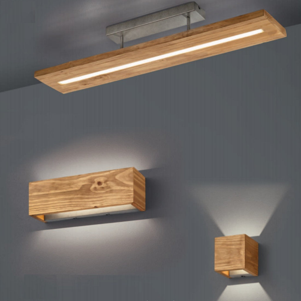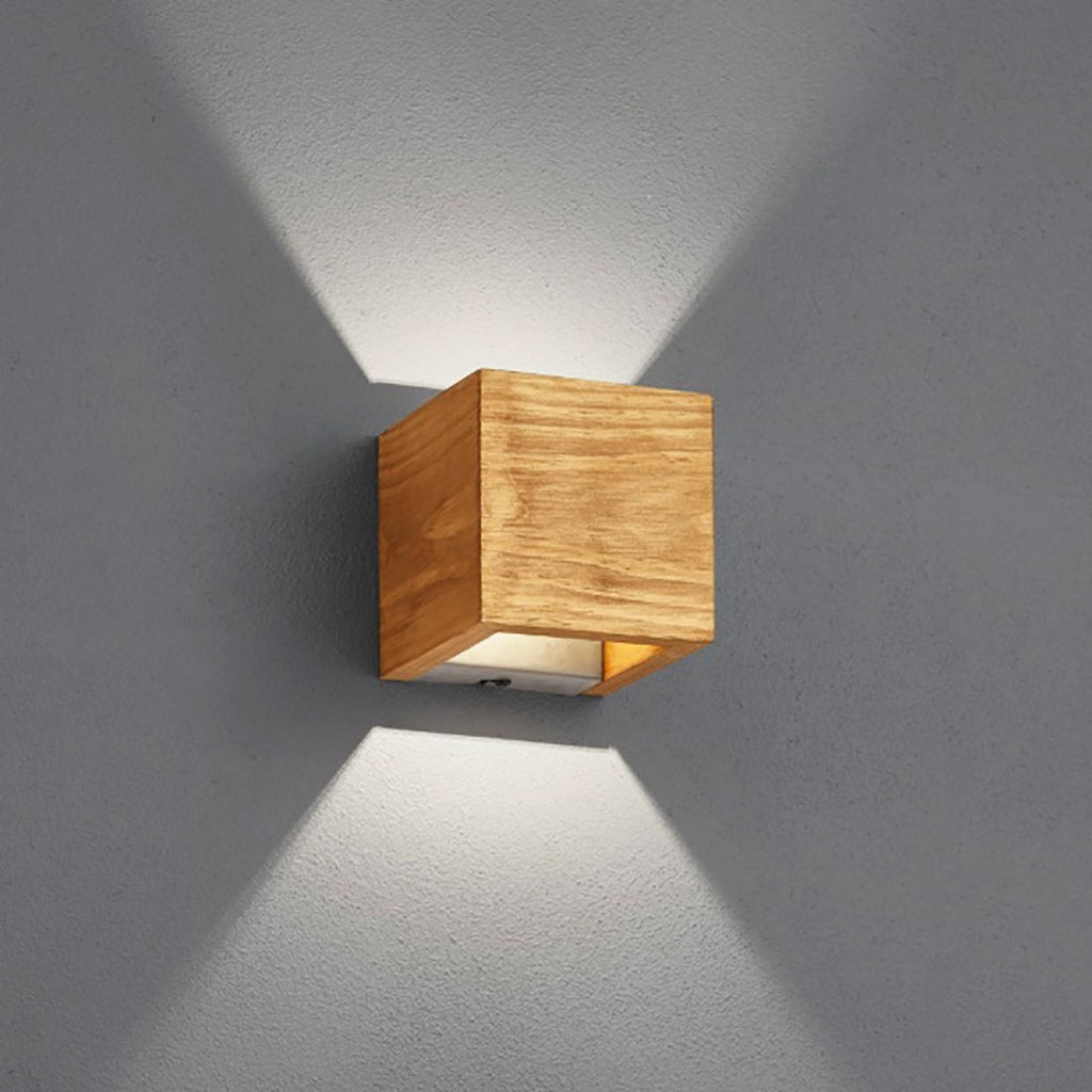 Lampada da parete in metallo con finitura legno chiaro. LED integrato 4,3W, 430 lumen, 3000K, CRI 80. SwitchDimmer 3 livelli, IP20, classe II. Dimensioni 11×11×11 cm. Durata 50000h, 50000 cicli ON/OFF. Garanzia 5 anni.
