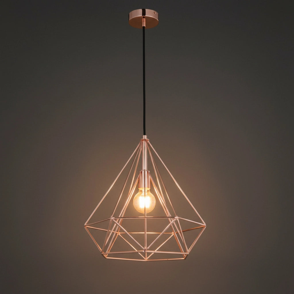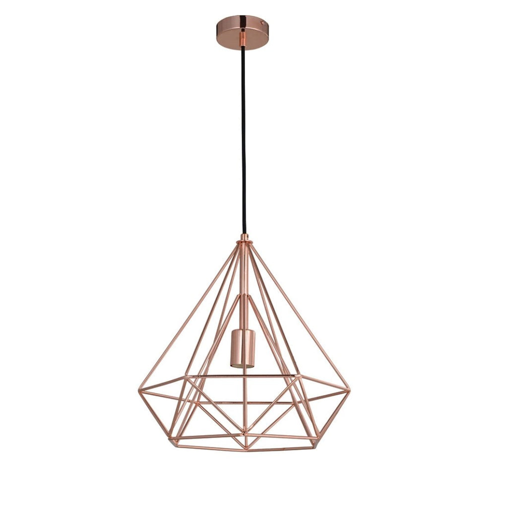Lampadario a sospensione Cage in metallo rame lucido a gabbia forma diamante. Larghezza 37 cm, altezza regolabile fino a 160 cm. Portalampada per 1 lampadina E27 (non inclusa). Ideale per cucine, soggiorni, camerette e locali come bar e ristoranti in stile retrò e industriale.