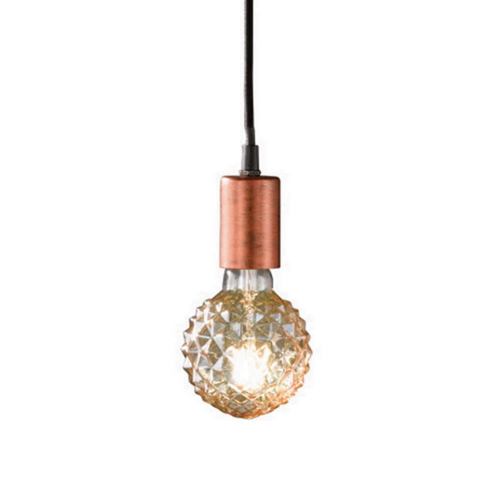 Lampadario con cavo in tessuto e montatura color rame antico, stile vintage industrial, altezza regolabile max 150 cm. Lampadina attacco E27 non inclusa