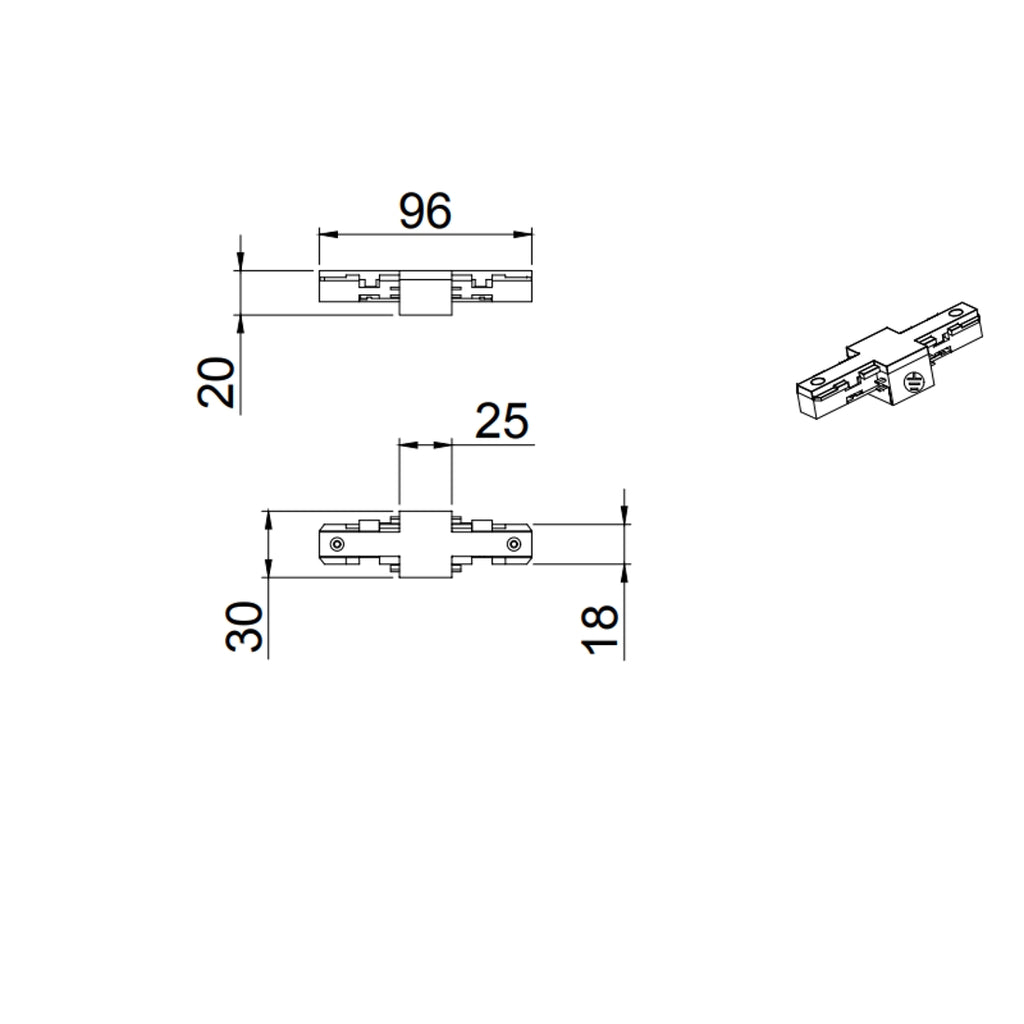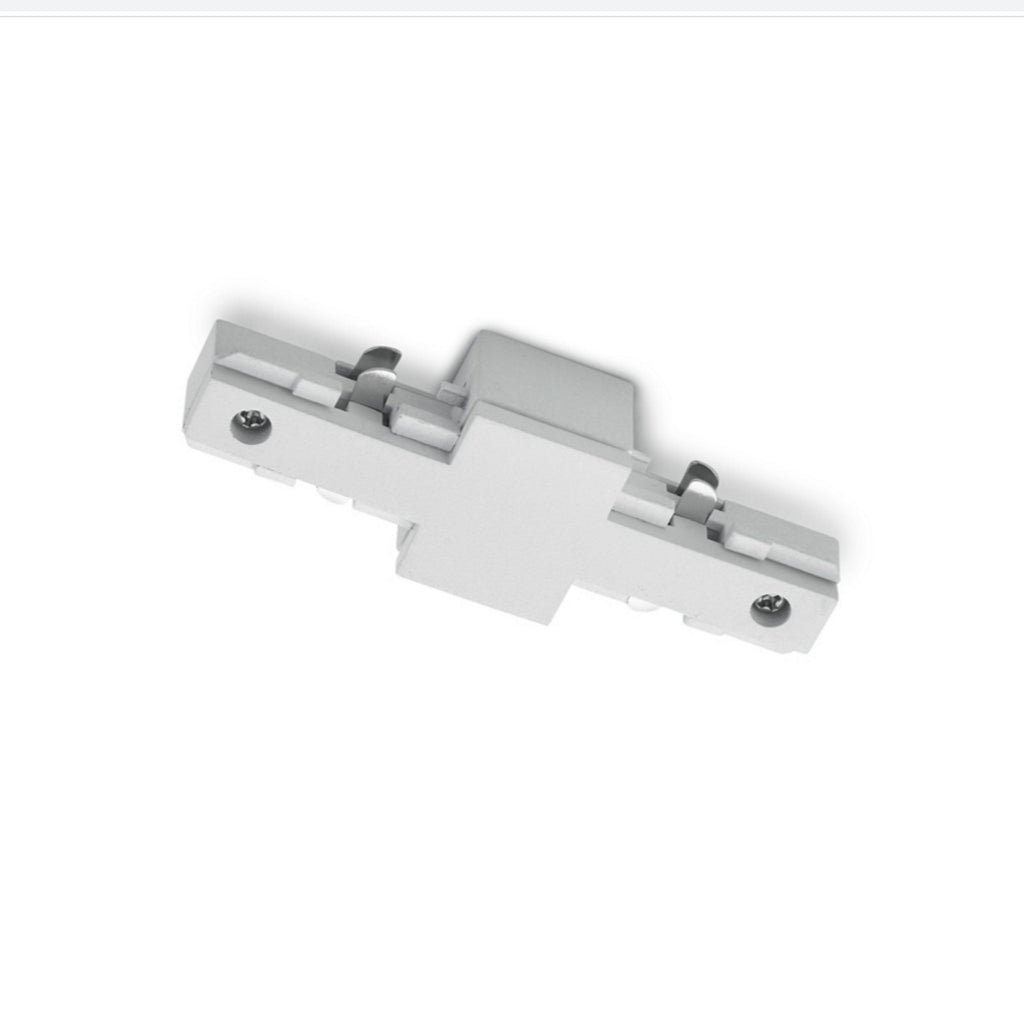 Connettore lineare per unire due binari del sistema a binario bifase DUOline. Garantisce continuità elettrica e meccanica, disponibile nei colori nero, bianco e acciaio satinato.
