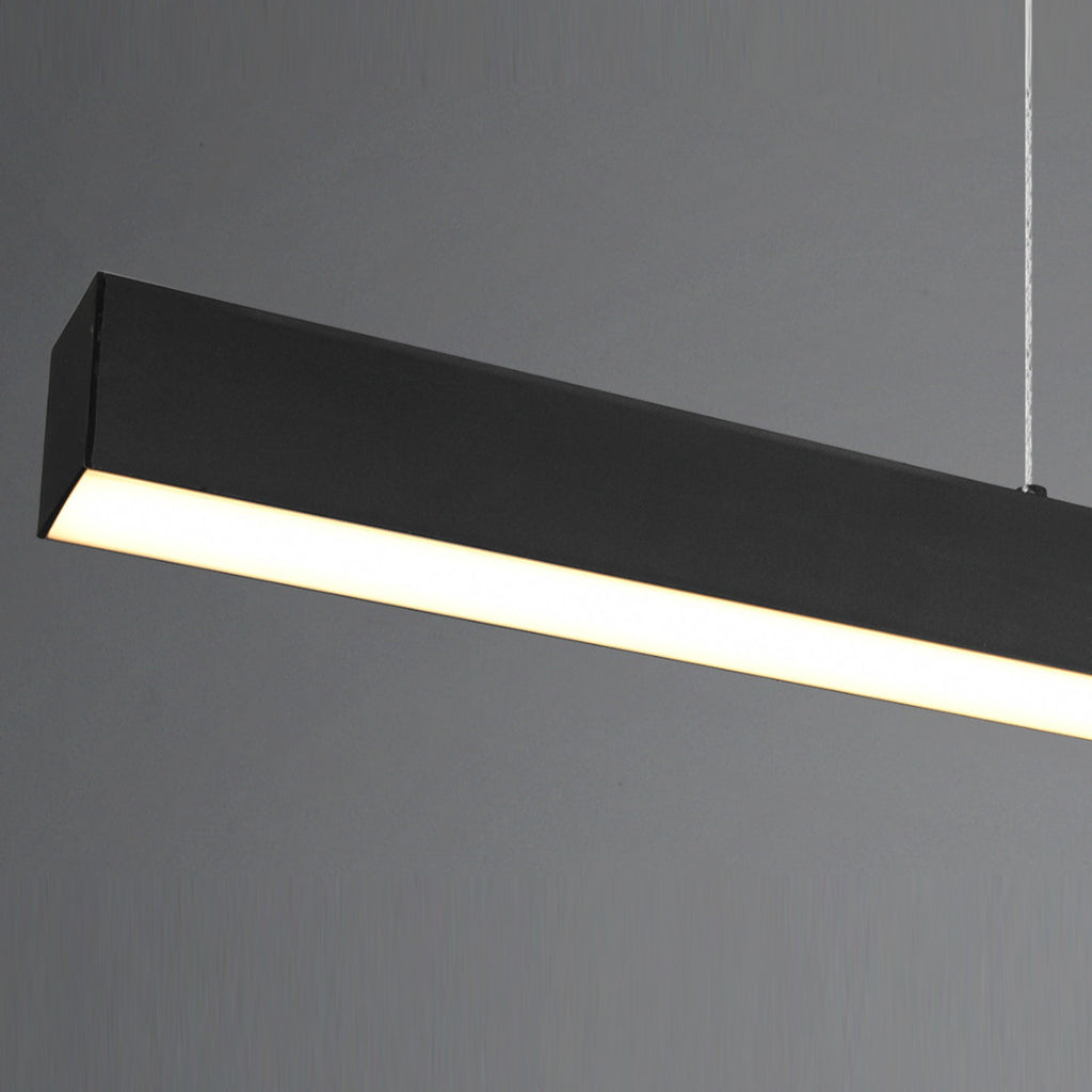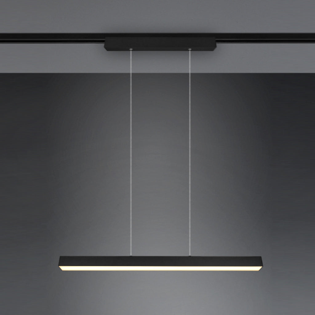 Sospensione lineare Paros in metallo verniciato nero opaco per sistema a binario bifase DUOline 230V componibile. Larghezza 90 cm, altezza regolabile fino a 180 cm. Luce LED biemissione 29W (3400 lm) bianco caldo 3000K, dimmerabile. Ideale per illuminare tavoli, banconi, uffici e spazi commerciali con luce diretta e indiretta di design.