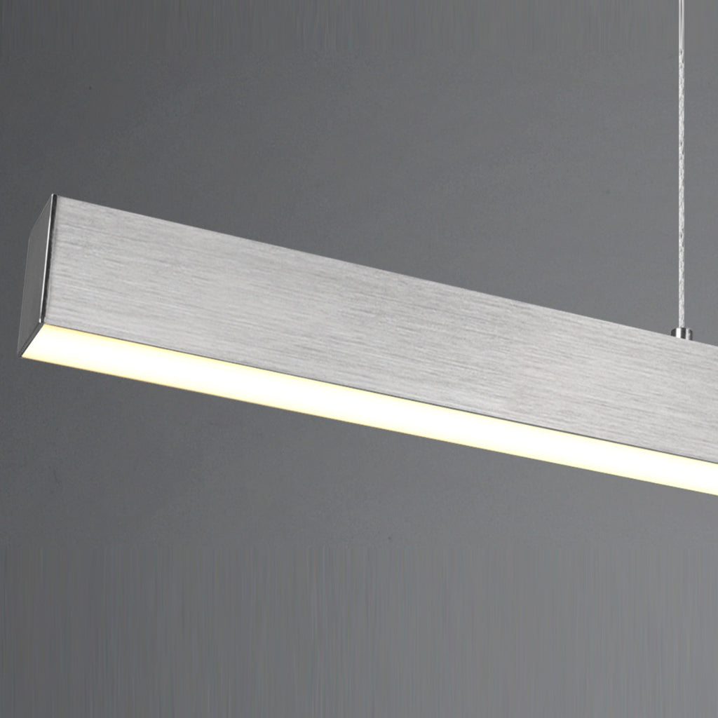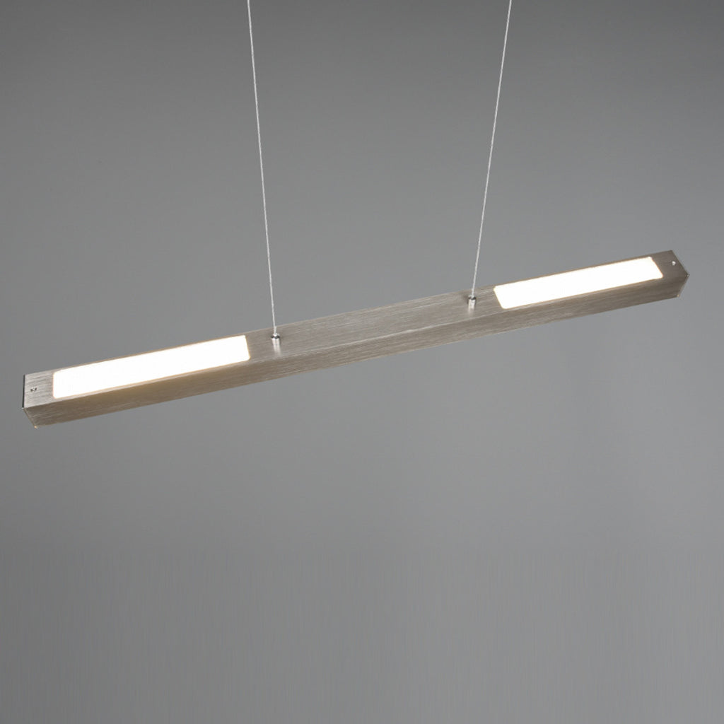 Sospensione lineare Paros in metallo finitura acciaio satinato per sistema a binario bifase DUOline 230V componibile. Larghezza 90 cm, altezza regolabile fino a 180 cm. Luce LED biemissione 29W (3400 lm) bianco caldo 3000K, dimmerabile. Ideale per illuminare tavoli, banconi, uffici e ambienti professionali con luce diretta e indiretta.
