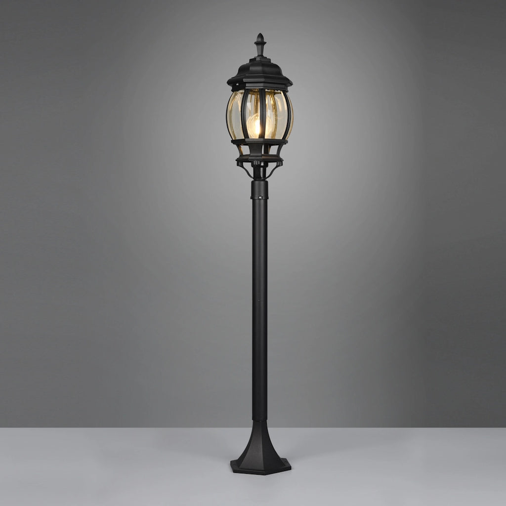 Lampioncino segnapasso in alluminio pressofuso nero opaco con vetro stondato. Altezza 100 cm ideale per vialetti e terrazzi. Attacco E27 per lampadina LED non inclusa.