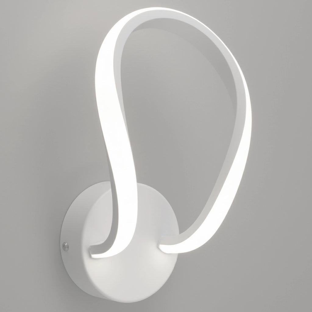 Applique LED moderna Forever in metallo bianco con design curvo minimale. Altezza 17 cm. LED integrato 8W, 600 lumen, luce bianco neutro 4500K, non dimmerabile. Ideale per cucina, soggiorno, camere da letto e spazi commerciali come hotel, ristoranti, negozi e uffici, coordinata con lampadario, plafoniera e lampada da appoggio della stessa serie.