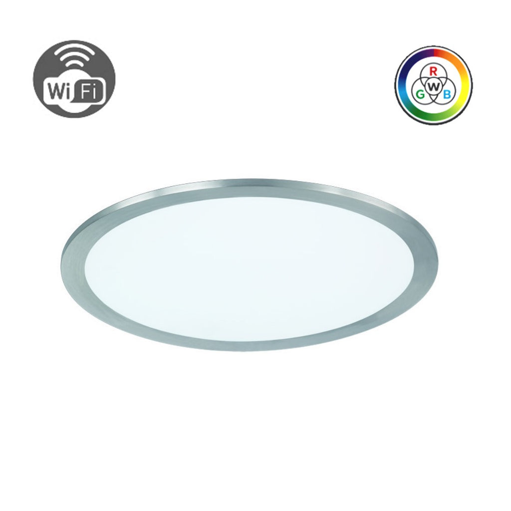 Plafoniera tonda con bordo acciaio, Ø30 cm, IP20. LED 15W, 1780 lm, bianco dinamico 3000–5500K + RGB. Controllo via App WIZ, Alexa/Google Home e telecomando (dimmer 0–100%). Garanzia 5 anni.