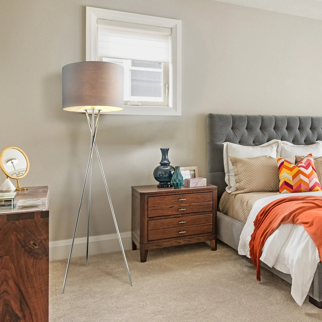 Lampada da terra a treppiede in metallo cromato lucido, paralume tondo Ø45 cm in tessuto grigio. Altezza 160 cm, attacco E27 (lampadina non inclusa). Design moderno ed elegante, ideale per soggiorno, camera o studio.
