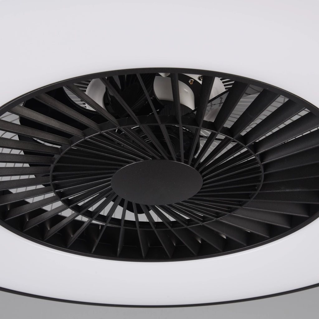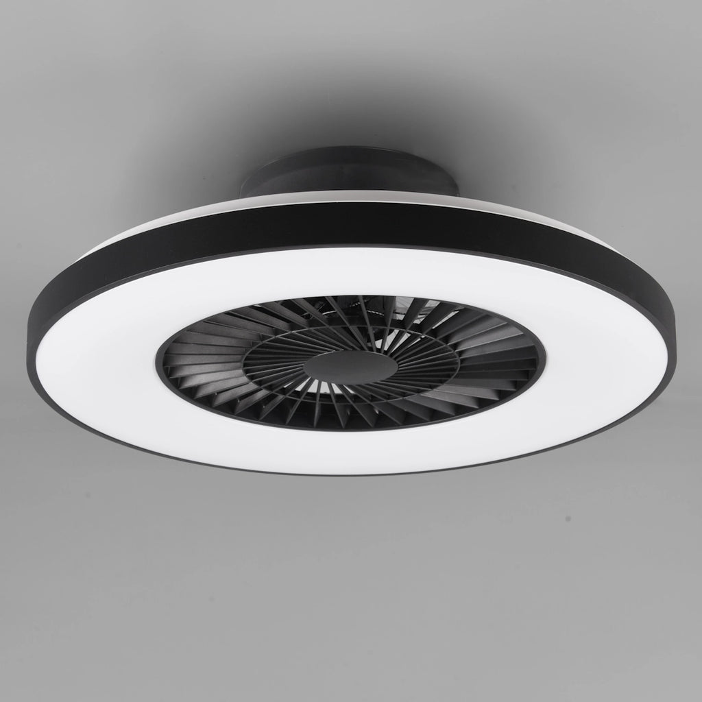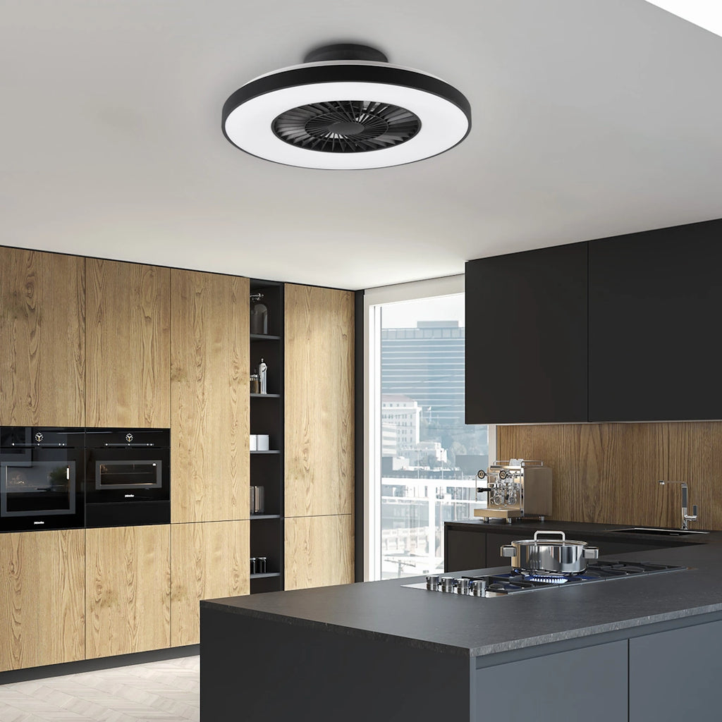 Plafoniera LED moderna con ventilatore integrato e telecomando. Diametro 59 cm, LED 40W dimmerabile da 0 a 100%, 3.900 lumen con luce bianca calda, neutra e fredda da 3000K a 6500K. Funzione timer, modalità notte, 3 velocità di ventilazione e 5 anni di garanzia del produttore.