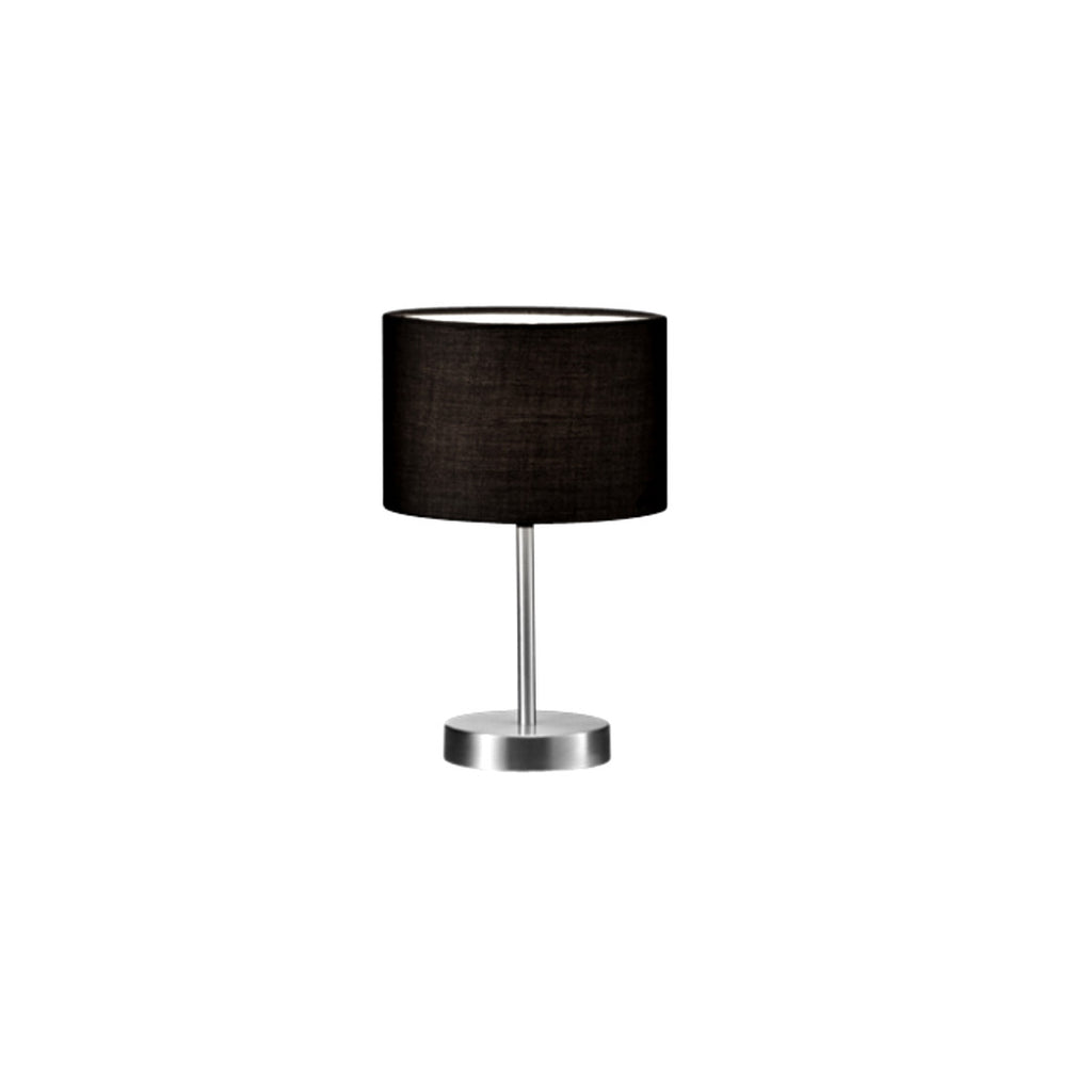 Lampada da appoggio HOTEL in acciaio satinato altezza 32 cm. Paralume in tessuto nero diametro 20 cm. Lampadina attacco E14 non inclusa.