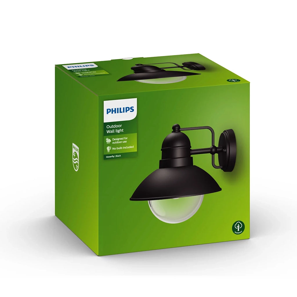 Applique da esterno Philips Hoverfly in alluminio nero con diffusore trasparente. Attacco E27 per lampadine LED, grado di protezione IP44. Stile moderno ispirato alle lanterne marine, adatta per pareti esterne di terrazzi, balconi e ingressi. Lampadina non inclusa.
