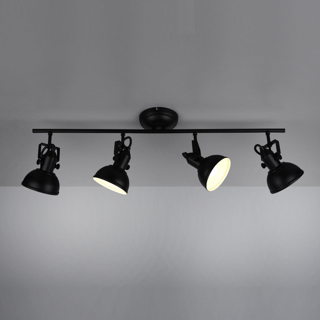 Plafoniera con 4 faretti orientabili in metallo nero opaco, installabile a parete o soffitto. Compatibile con lampadine E14 (non incluse), perfetta per interni dallo stile industriale o vintage. Struttura robusta e orientabile per luce mirata.