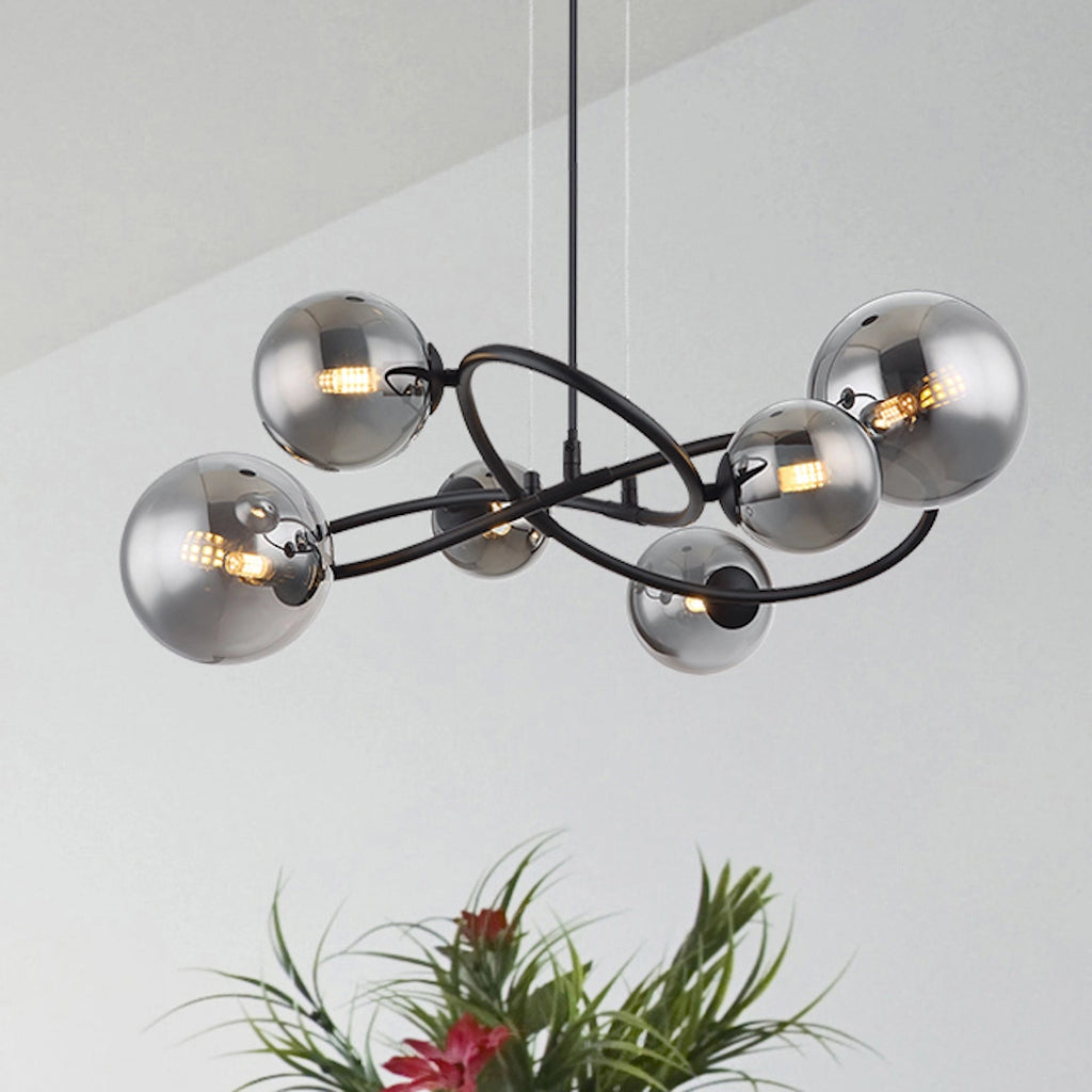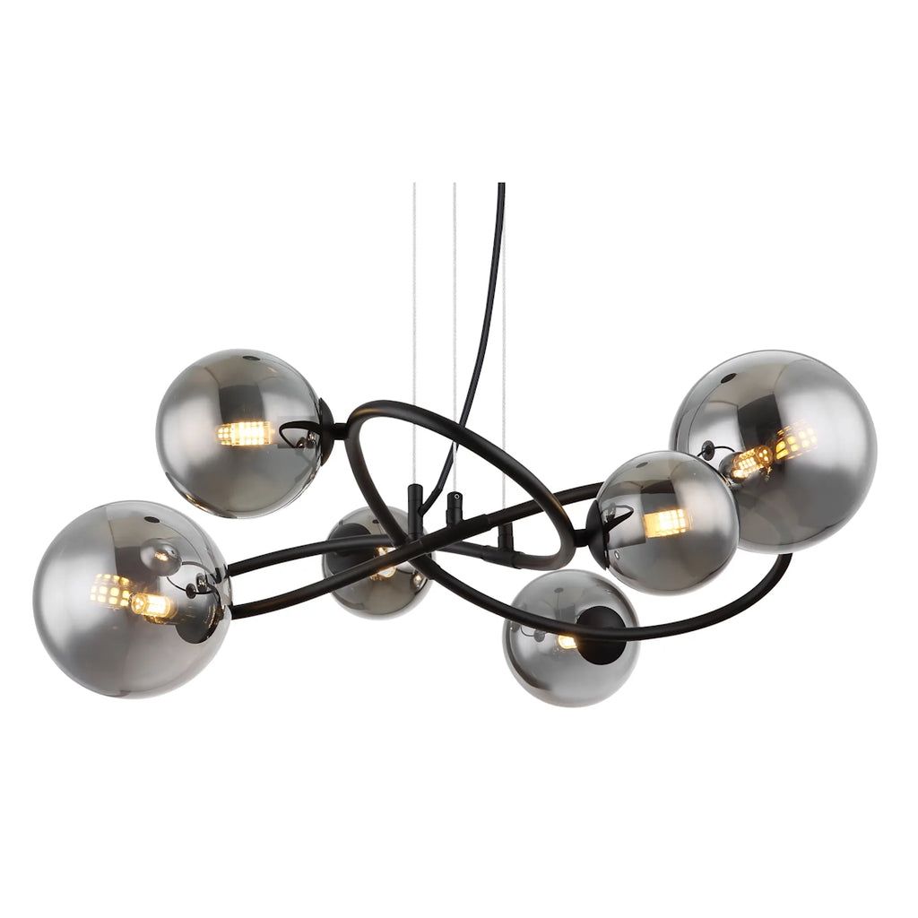 Lampadario in metallo nero opaco design moderno intrecciato con diffusori in vetro fumè. Diametro 62 cm, altezza regolabile fino a 120 cm tramite cavo nero. Dotato di 6 lampadine LED attacco G9 incluse, 6 × 3W, 2100 lumen totali, luce bianco caldo 3000K, lampadine sostituibili.