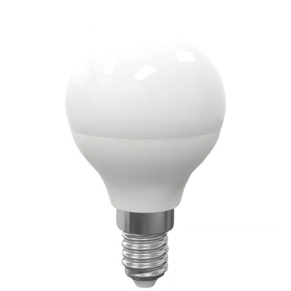 Lampadina LED E14 forma sfera o mini globo, potenza 6W e 520 lumen. Luce calda 3000K, naturale 4000K o fredda 6500K. Equivalenza 40W alogena, non dimmerabile, durata 15000h, CRI 80. Altezza 80 mm, diametro 45 mm.