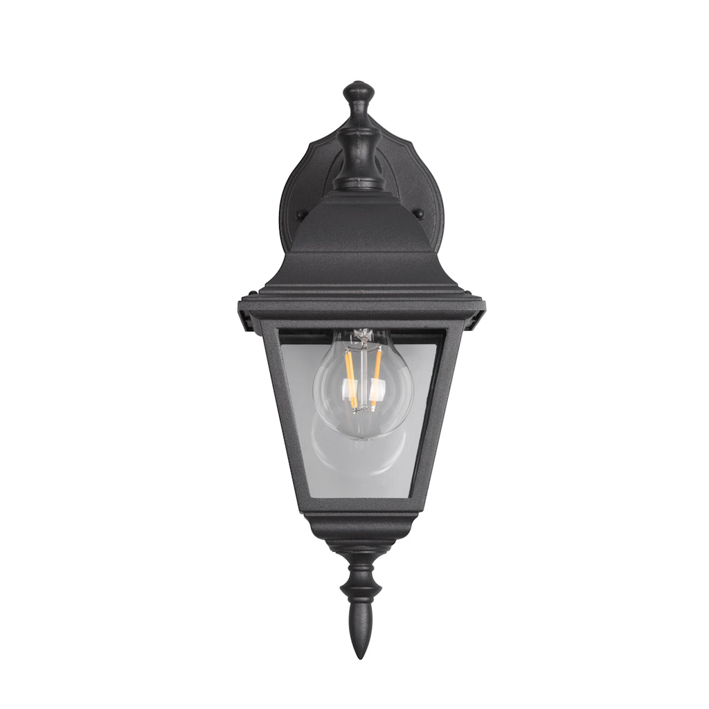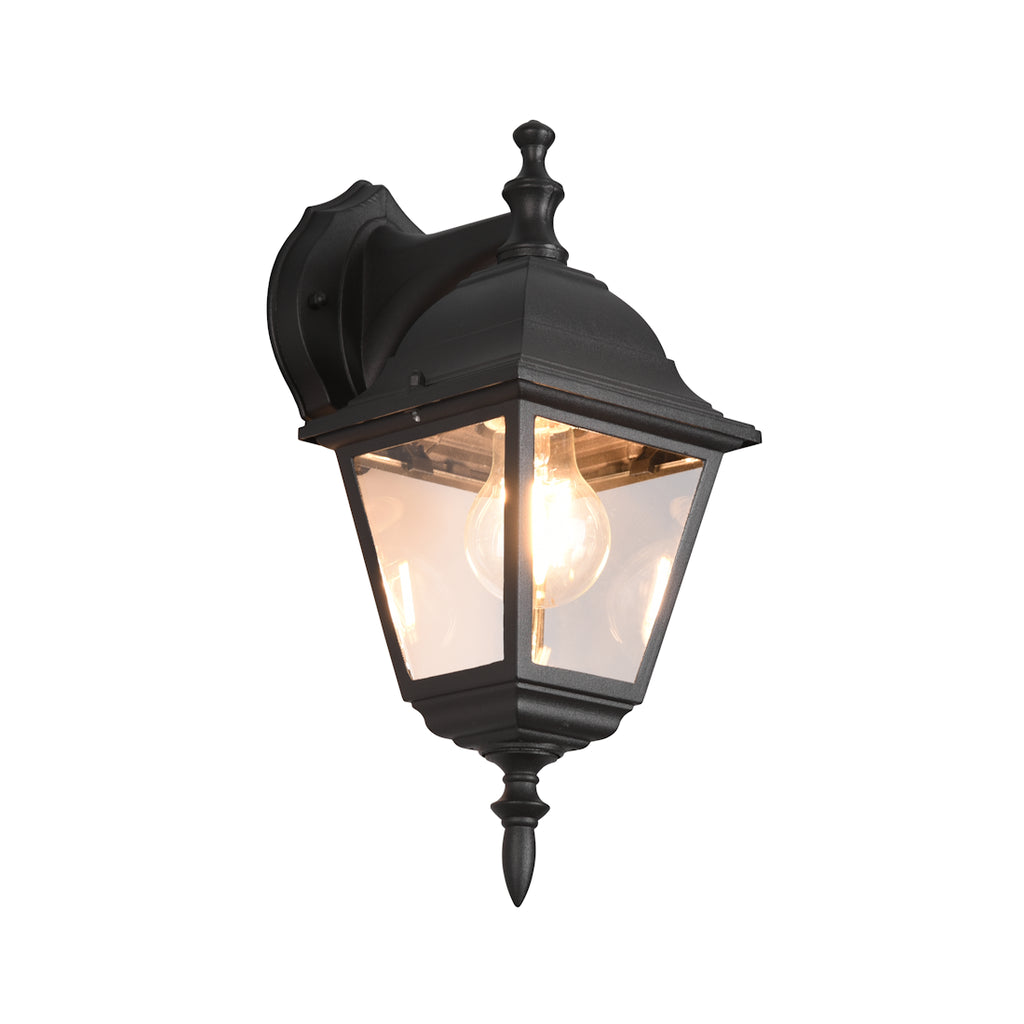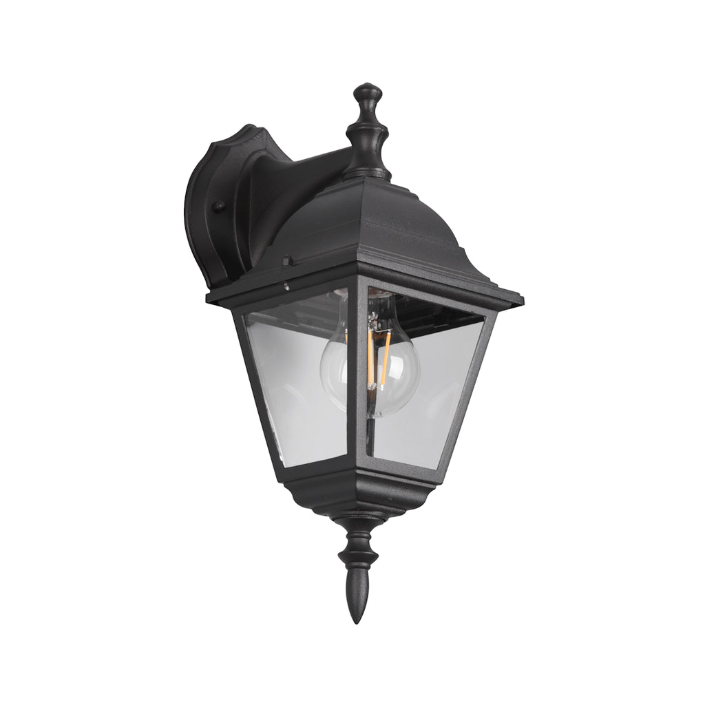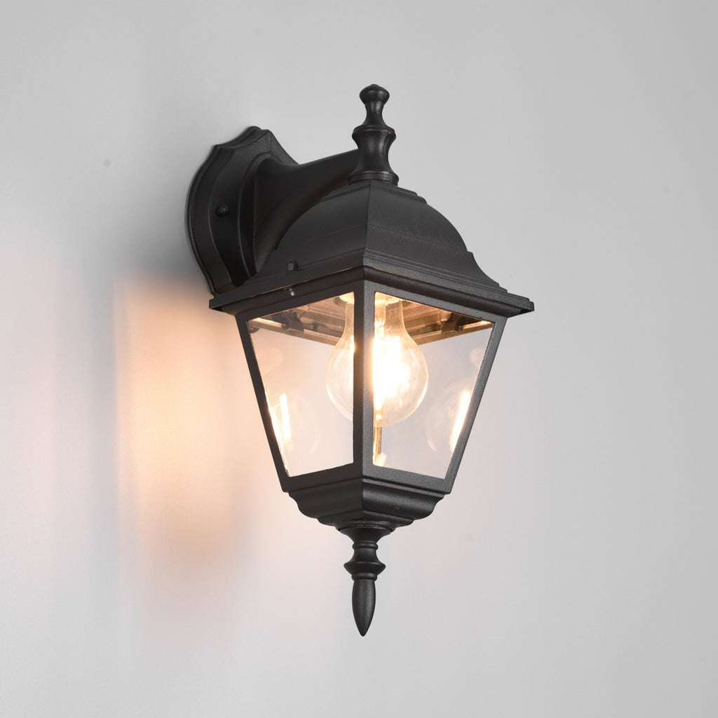 Applique da esterno classica con lanterna quadrata discendente in alluminio verniciato nero e vetro trasparente. Con un’altezza di 33 cm e grado di protezione IP44, è ideale per ingressi, terrazzi e facciate, resistente a pioggia e umidità. Compatibile con lampadine LED o alogene con attacco E27 (non inclusa), unisce stile tradizionale e materiali di qualità per un’illuminazione esterna raffinata e duratura.