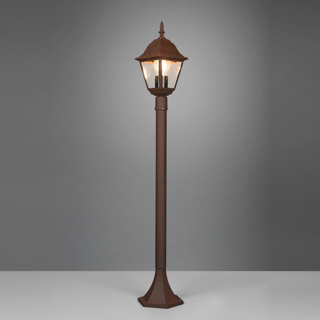 Lampioncino da giardino in alluminio corten antichizzato, altezza 100 cm, IP44. Attacco E27 per lampadina LED o alogena (non inclusa). Stile rustico con lanterna quadrata, ideale per vialetti, cortili e ingressi. Struttura resistente alle intemperie.