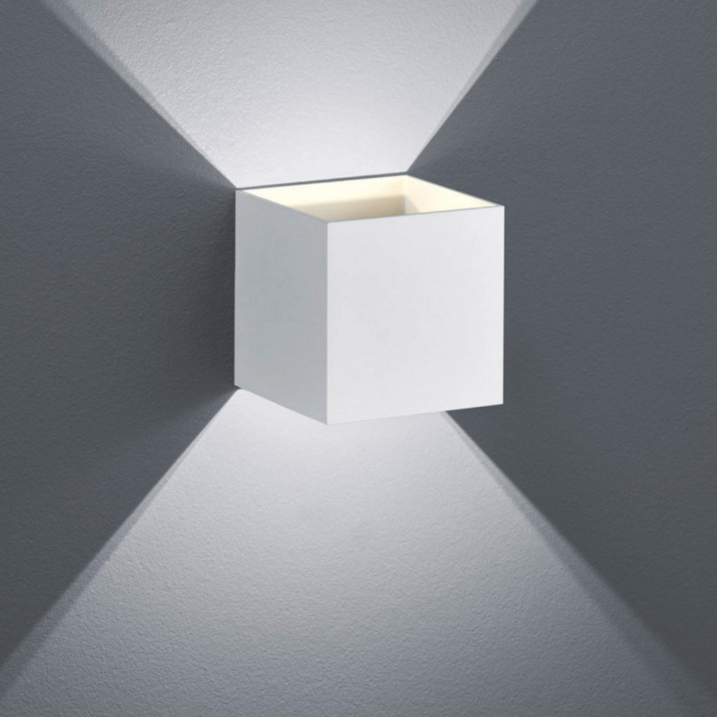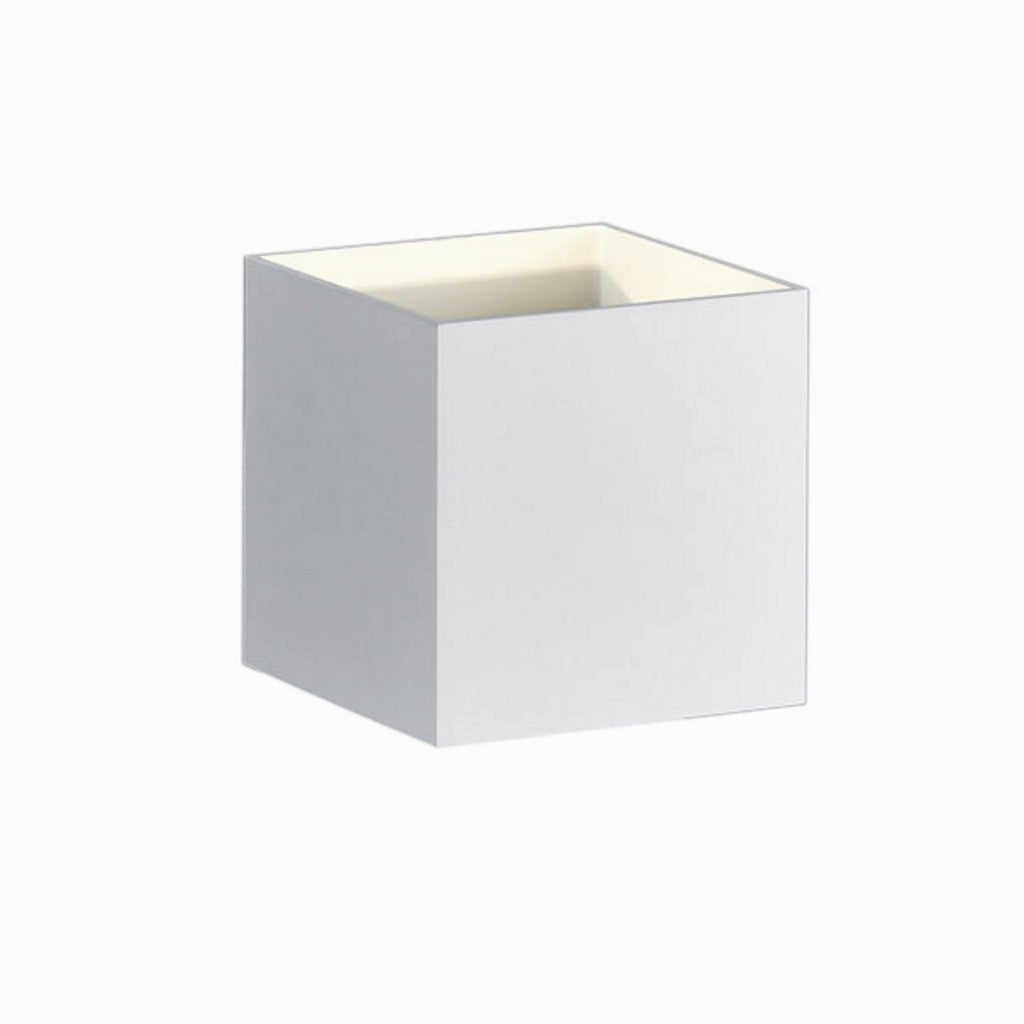 Applique cubica da interno in metallo bianco. Doppia emissione luce sopra e sotto. LED integrato 4,5W, 430 lumen, 3000K. Dimensioni 10×10×10 cm. IP20. Garanzia 5 anni.