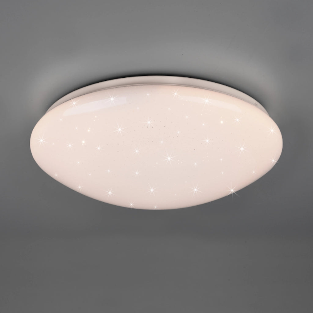 Plafoniera LED tonda Ø38 cm in policarbonato bianco satinato con effetto cielo stellato. LED da 18W, 2000 lumen, luce bianco CCT variabile 3000K–6000K, dimmerabile tramite telecomando incluso. Ideale per camere e ambienti moderni.