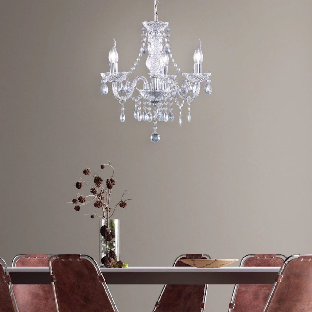 Lampadario Ø40 cm, 3 luci attacco E14 (lampadine escluse). Struttura in acrilico trasparente e metallo cromato. Design chandelier classico rivisitato, elegante e luminoso. Ideale per salotti, camere e sale da pranzo.