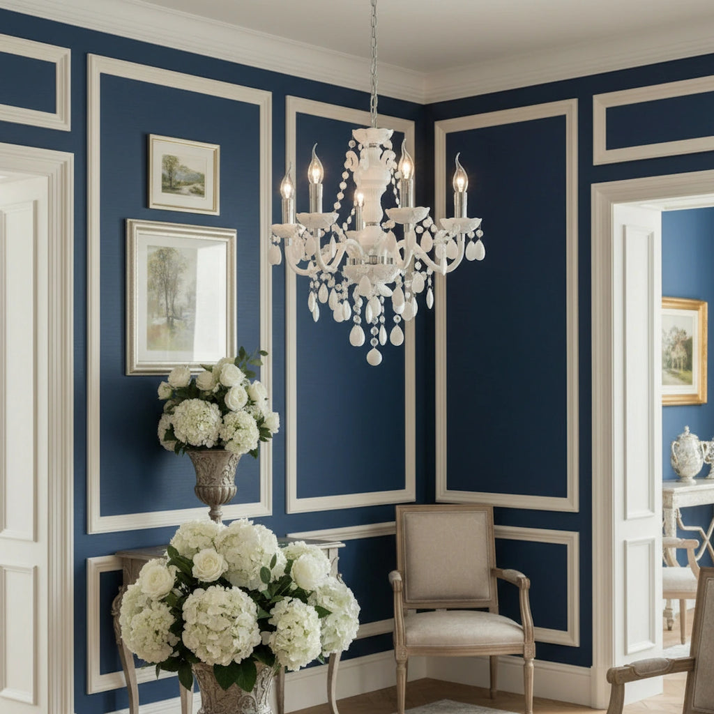 Lampadario Ø52 cm, 5 luci attacco E14 (lampadine escluse). Struttura in acrilico bianco con finitura lucida. Stile candeliere classico rivisitato in chiave moderna, ideale per salotti, camere o sale da pranzo.