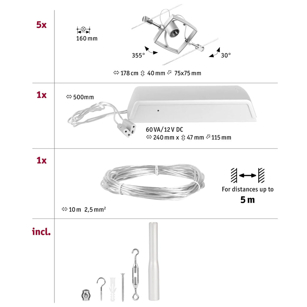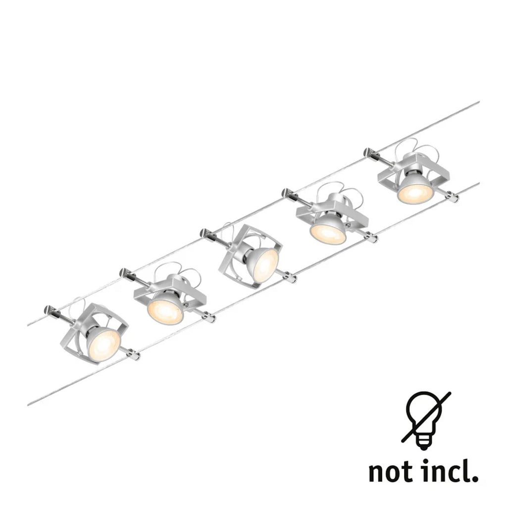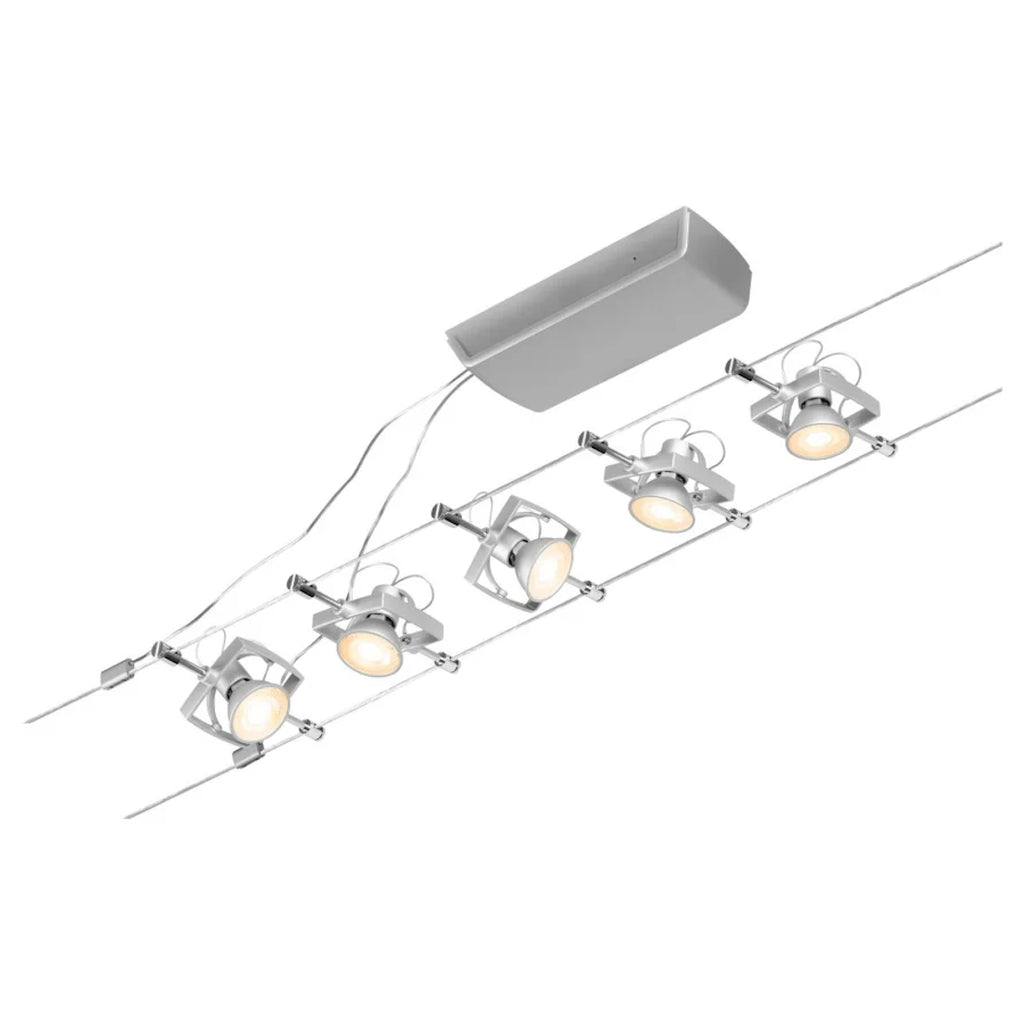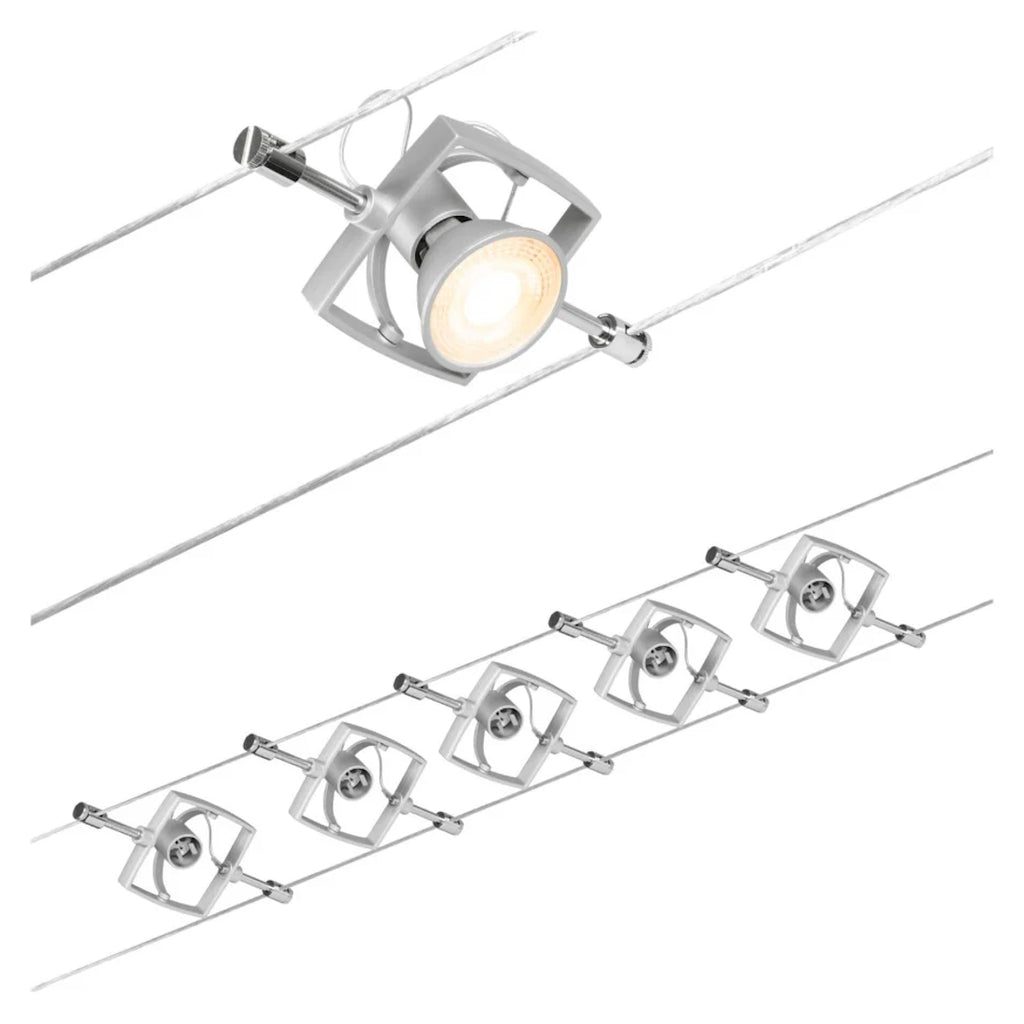 Sistema di illuminazione a cavo Paulmann Mac II da 10 m in elegante finitura argento opaco, completo di trasformatore e accessori di fissaggio. Installabile a parete o soffitto, in configurazioni lineari o angolate. Compatibile con faretti LED da 6W, 445 lumen, luce 2700K o 4000K (non inclusi). Ideale per abitazioni moderne, showroom, vetrine e installazioni professionali.