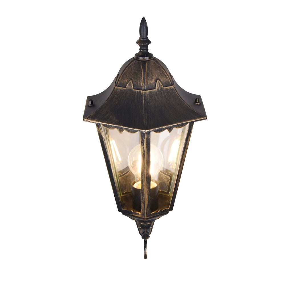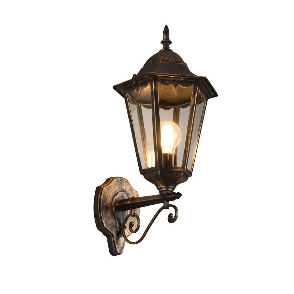Applique da esterno con lanterna esagonale ascendente. Alluminio pressofuso nero con finitura antichizzata oro, vetri trasparenti. Attacco E27, lampadina non inclusa. Altezza 51 cm, IP44, struttura leggera e resistente. Stile tradizionale italiano ispirato ai prodotti artigianali in ferro battuto.
