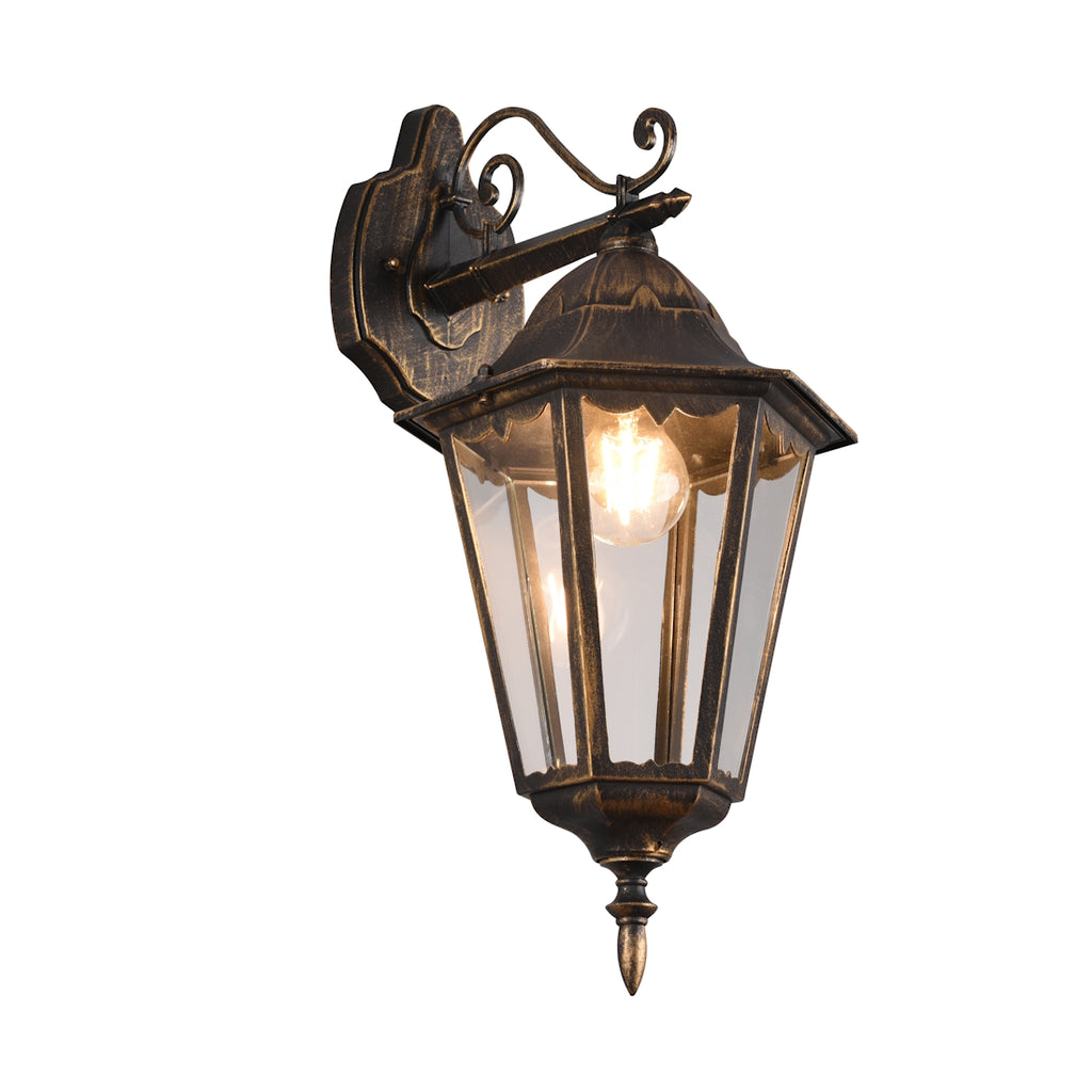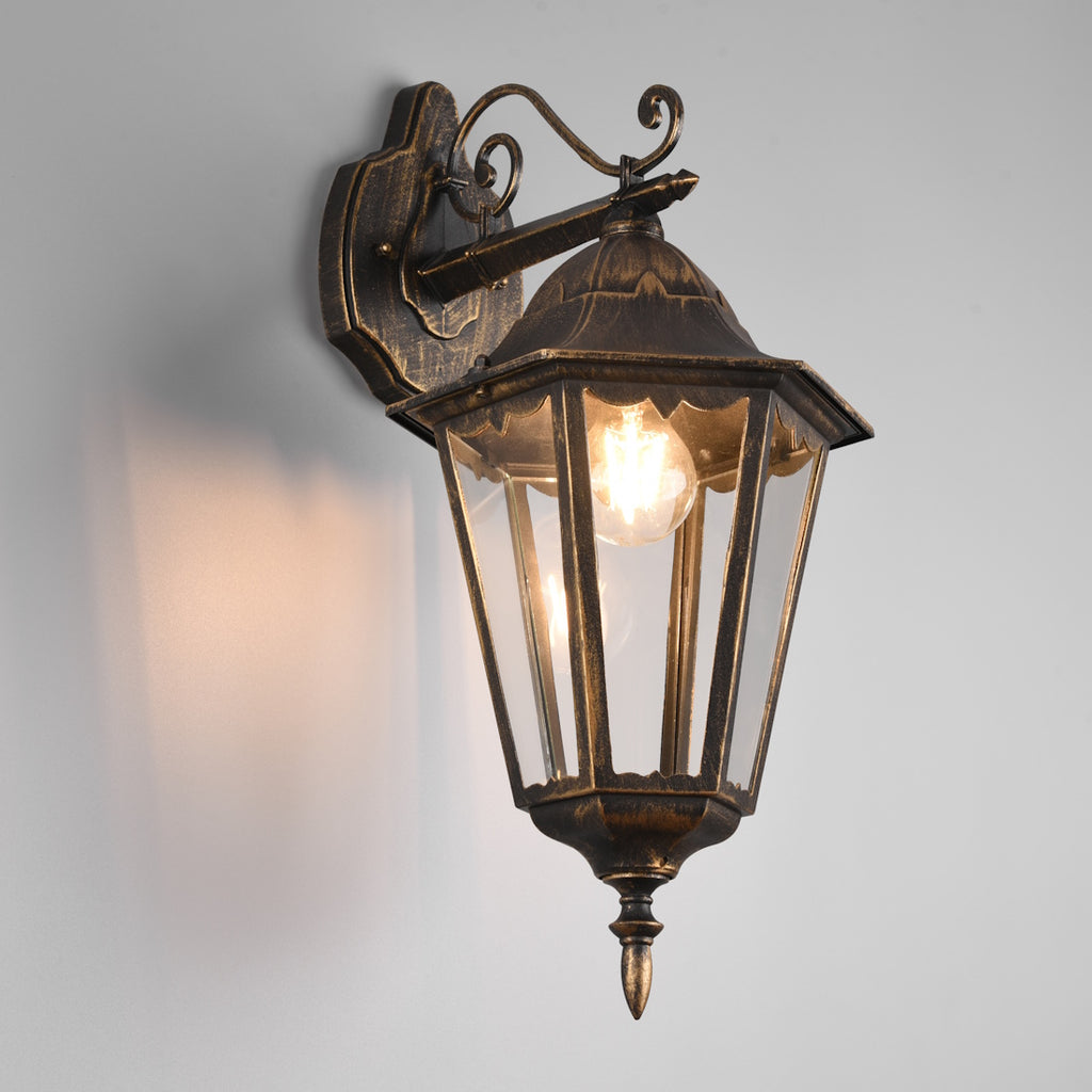 L’applique da esterno Brianza è un modello iconico dell’illuminazione classica italiana, qui proposto nella versione discendente con finitura nera e dettagli oro antichizzato. Realizzata in alluminio pressofuso con lanterna esagonale in vetro trasparente, garantisce una diffusione luminosa a 360° e un’eccellente resistenza agli agenti atmosferici grazie al grado di protezione IP44. Compatibile con lampadine LED o alogene con attacco E27 (non inclusa), unisce estetica artigianale e solidità costruttiva, perfetta per ingressi, porticati e terrazzi in stile classico.