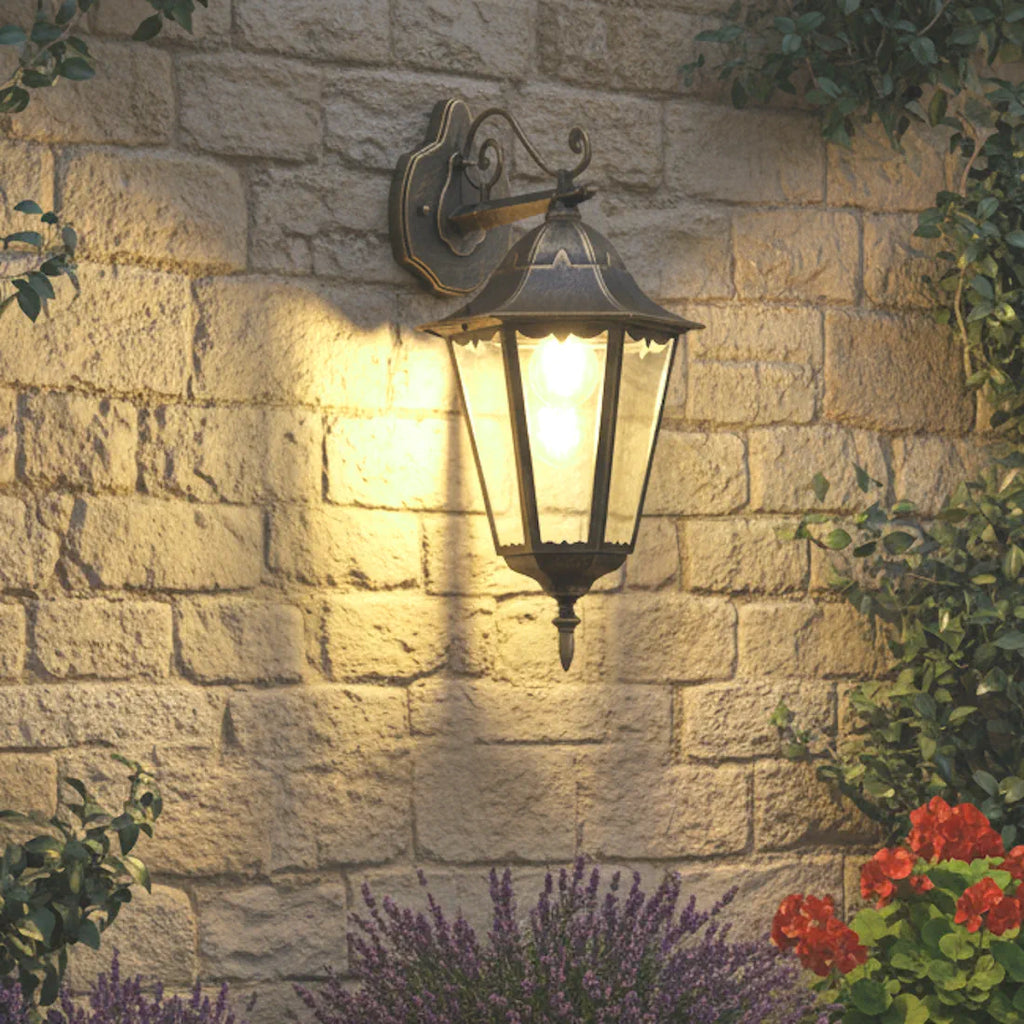 Una lampada da parete elegante e senza tempo, parte della linea Brianza. La finitura nera con dettagli oro e la lanterna esagonale discendente valorizzano qualsiasi ambiente esterno, con un fascino tipicamente italiano.