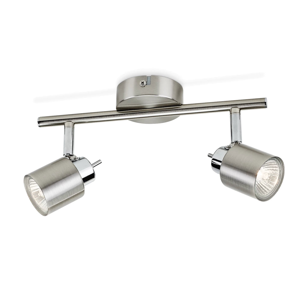 Faretto orientabile 2 luci della serie Meranti Philips. Montaggio a parete o soffitto. Struttura in metallo finitura satinata con dettagli cromati lucidi. Spot regolabili. Attacco GU10 (lampadine non incluse). Ideale per ambienti interni moderni come cucina, soggiorno, corridoio, camere e bagno.
