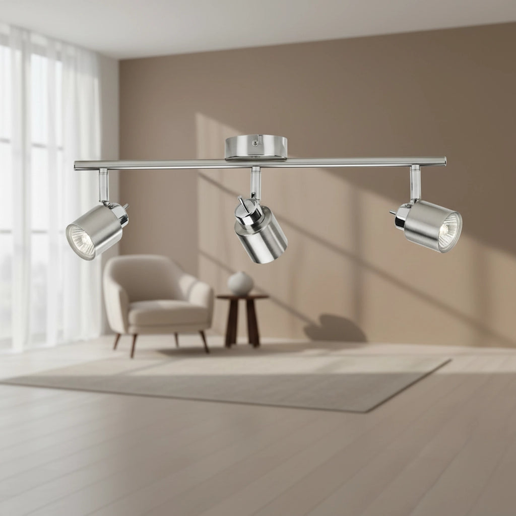 Lampada con 3 faretti orientabili in metallo finitura satinata effetto spazzolato. Design moderno installabile a parete o soffitto. Attacco GU10 (lampadine non incluse). Ideale per ambienti interni moderni come cucina, soggiorno, corridoio, camere e bagno oppure per ufficio.