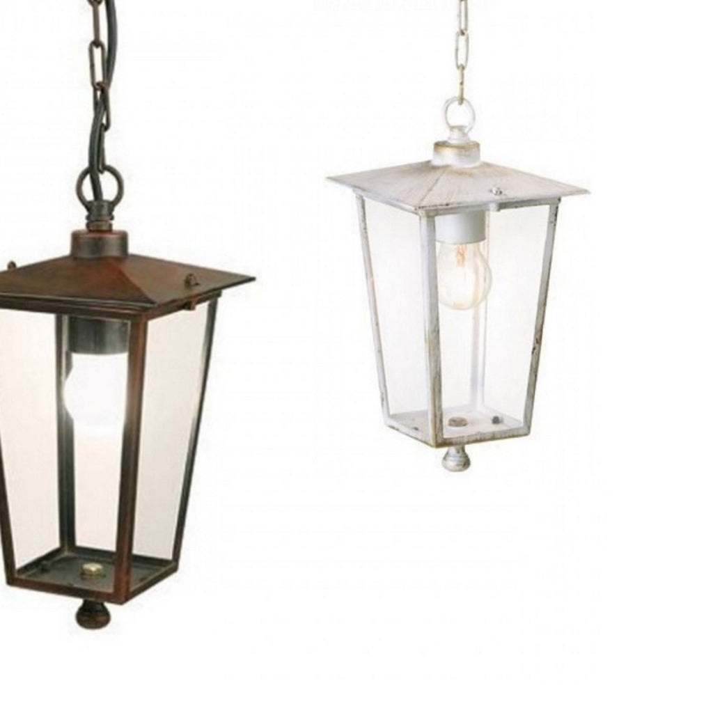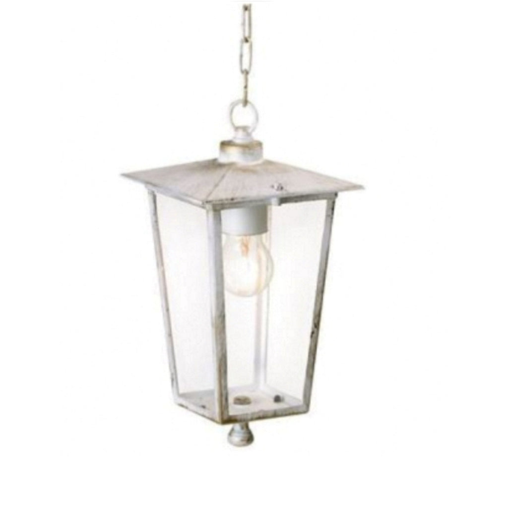 Lampada a sospensione Notorius da esterno in alluminio verniciato bianco antichizzato con vetri trasparenti. Altezza regolabile tramite catena, grado di protezione IP44, attacco E27 compatibile con lampadine LED. Ideale per terrazzi, balconi, verande e gazebo in stile rustico o classico.