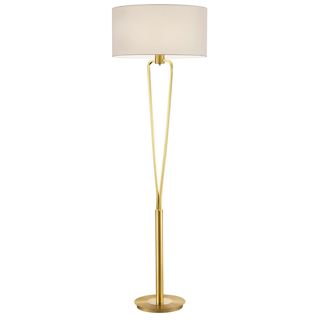 Lampada da terra in metallo con finitura oro lucido e paralume bianco in tessuto. Altezza 160 cm, attacco E27 (lampadina non inclusa). Interruttore sotto il paralume. Ideale per soggiorni e camere da letto.