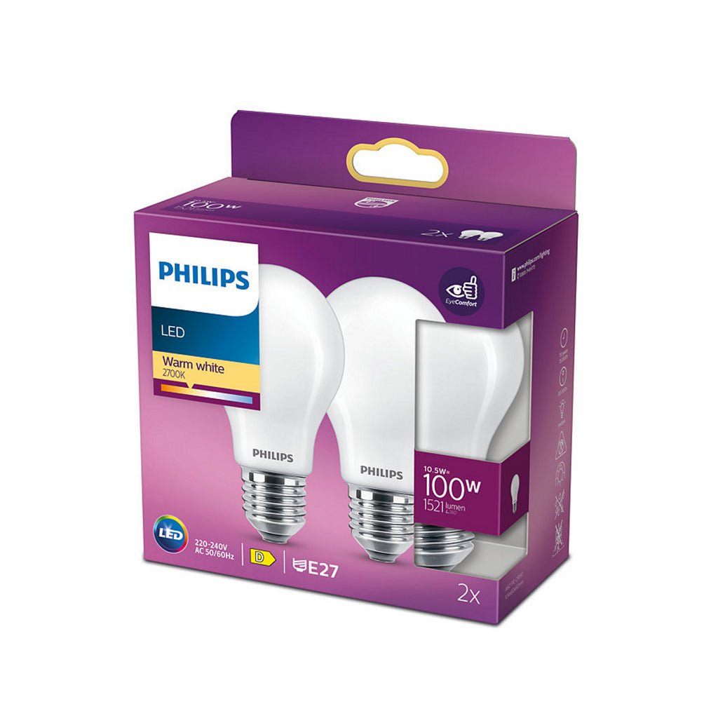 La confezione contiene 2 lampadine LED Philips a goccia E27 da 10,5W.