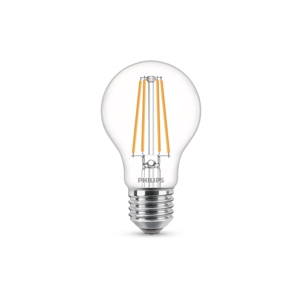 Lampadine LED E27 a goccia in vetro trasparente con filamenti a vista. Potenza 8,5W (equivalenti 75W), 1055 lumen, luce bianco caldo 2700K, apertura 150°. Durata 15.000 ore, 15.000 cicli ON/OFF. Alta efficienza e risparmio energetico, perfette per lampadari e plafoniere.