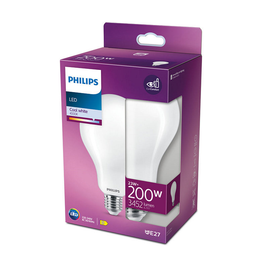 La lampadina LED Philips A95 con attacco E27 da 23W produce 3452 lumen di luce bianco naturale a 4000K, offrendo un’illuminazione potente ed equilibrata. Con una resa pari a una vecchia lampadina alogena da 200W, è ideale per chi necessita di grande luminosità riducendo i consumi.