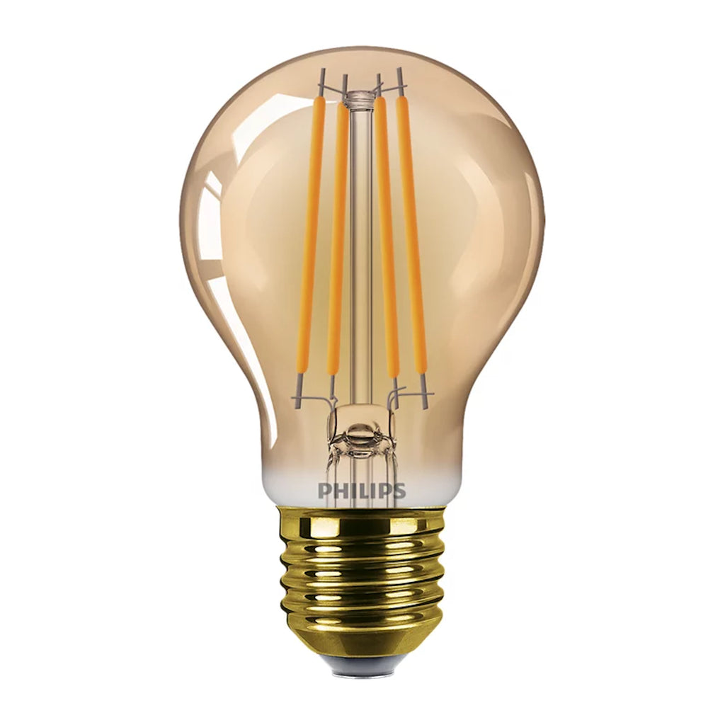 Lampadina LED a filamento A60 con vetro ambra e attacco E27. Con 25W di consumo produce 250 lumen, corrispondenti a circa 25W equivalenti di resa luminosa. La tonalità di luce extra calda 1800K crea un effetto vintage ideale per ambienti classici, rustici e shabby chic. Non dimmerabile, è perfetta come lampadina decorativa per lampadari, applique e lampade da tavolo.