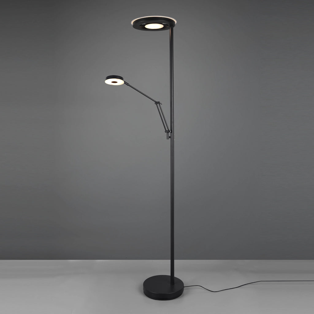 Lampada da terra LED con doppia luce integrata (32W + 6W), corpo in metallo, finiture acciaio satinato, nero opaco o ottone satinato. Altezza 181 cm, intensità e colore luce regolabili (2700–4000K) tramite TouchDimmer. Braccio flessibile orientabile per lettura. Garanzia 5 anni.