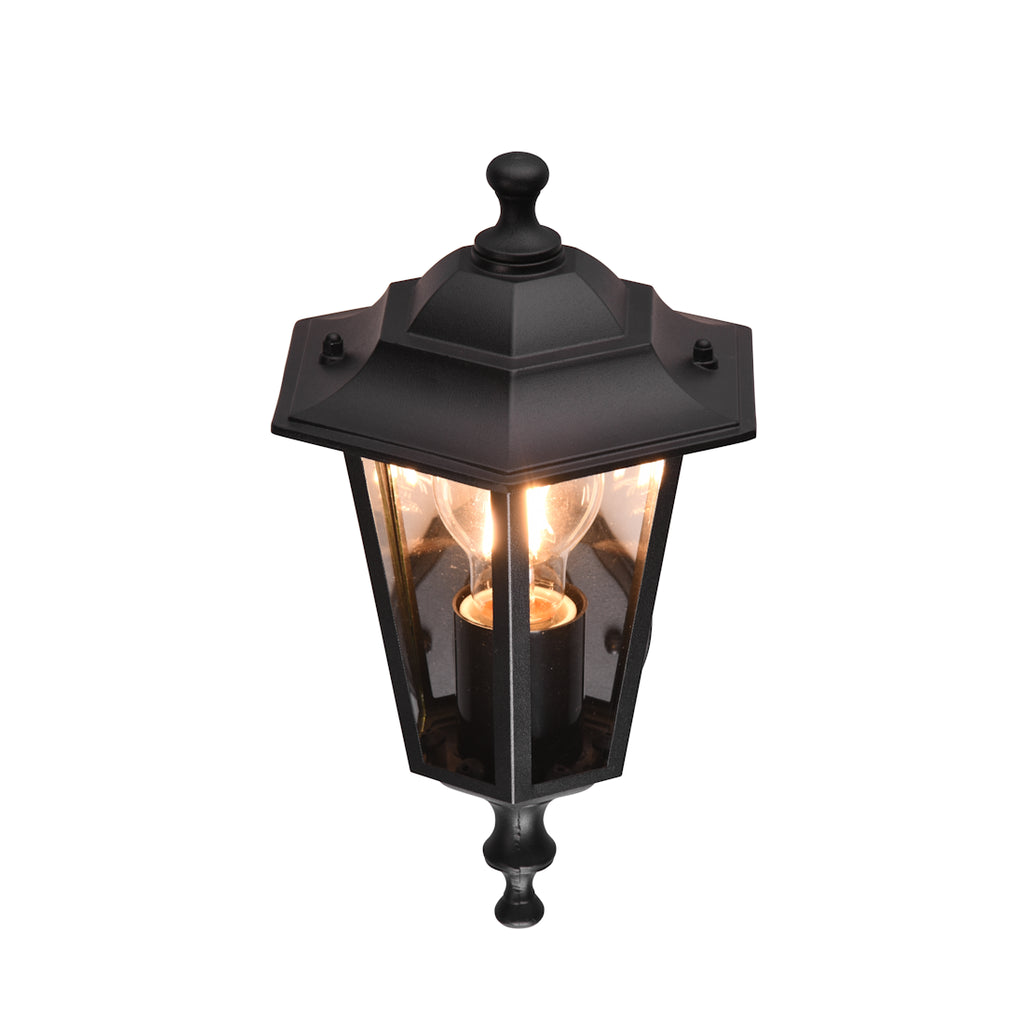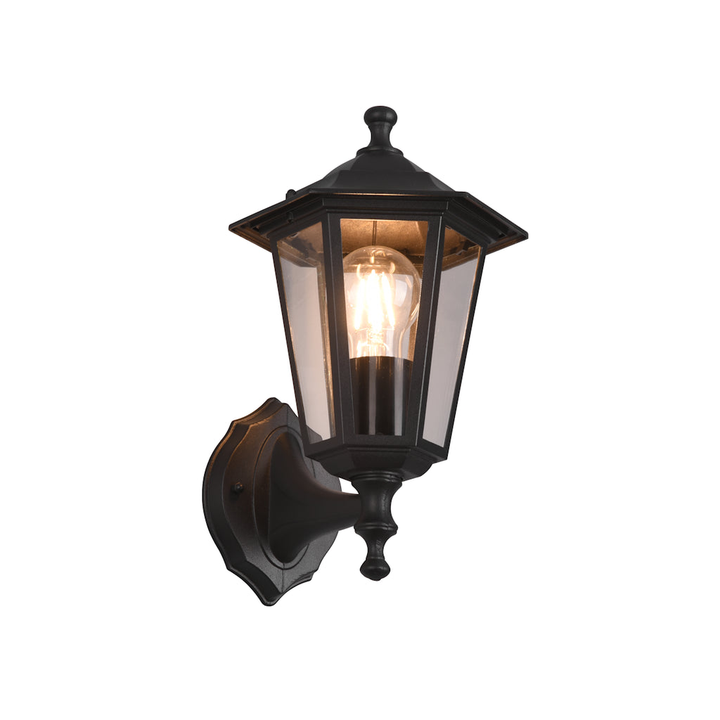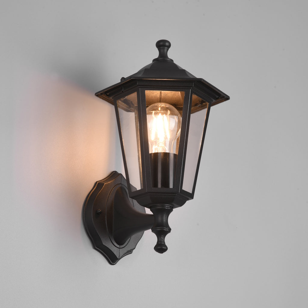 Lampada da esterno a parete con lanterna esagonale ascendente in alluminio nero e vetro trasparente. Altezza 31 cm, IP44, attacco E27, lampadina non inclusa. Stile classico tradizionale.