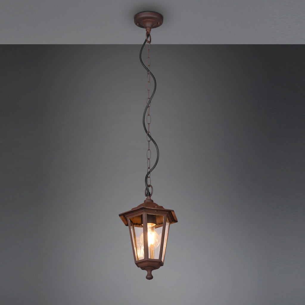 Lampada a sospensione da esterno in alluminio antichizzato color ruggine con lanterna esagonale e vetri trasparenti. Altezza 83 cm, grado IP44. Attacco E27 per lampadina LED o alogena (non inclusa). Stile classico ideale per porticati, ingressi e terrazzi coperti.