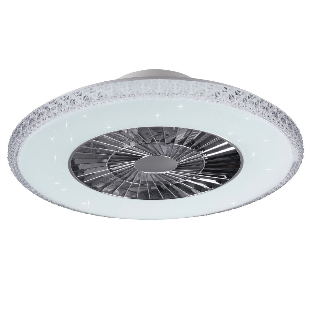 Plafoniera LED Harstad Ø60 cm, H18 cm. LED integrato 38W, 4400 lm, CCT 3000–6500K dimmerabile. Ventilatore 3 velocità, timer, funzione memoria e luce notturna. Struttura bianca con bordo cristallo effetto stelle. Telecomando incluso. IP20.