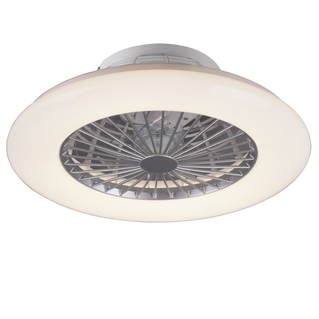 Plafoniera LED Ø49 cm bianca con finitura titanio, ventilatore 3 velocità, luce regolabile 3000K–6500K, dimmer, modalità notte, timer e telecomando. Ideale per camere e soggiorni.