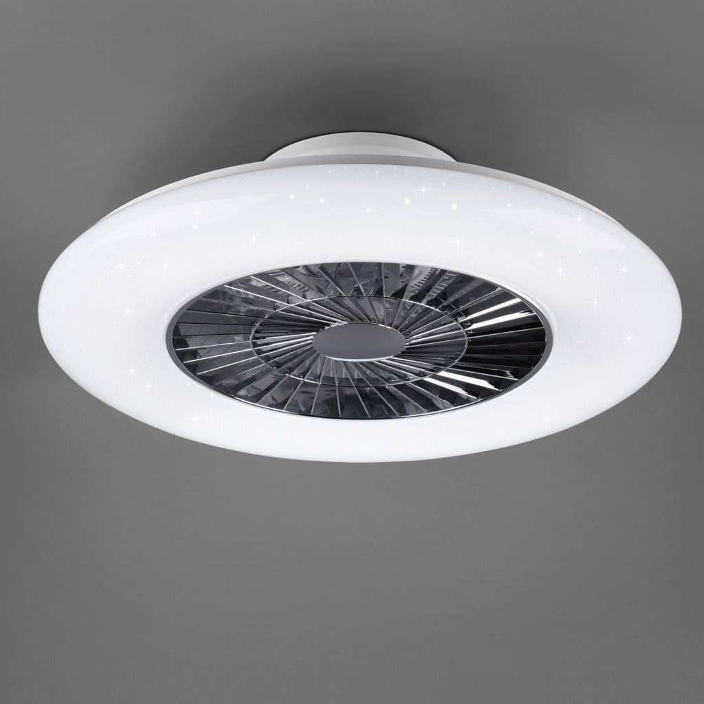 Plafoniera LED Visby Ø58 cm, H18 cm. LED integrato 38W, 4400 lm, CCT 2700–6500K dimmerabile. Ventilatore integrato 3 velocità, effetto stelle, modalità notte, timer e funzione memoria. Controllo da telecomando. Funzione estate/inverno. Struttura bianca IP20. Garanzia 5 anni.