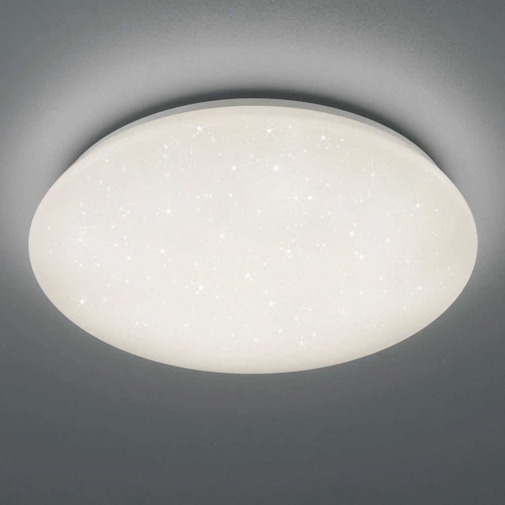 Plafoniera LED Potz Ø50 cm in policarbonato bianco satinato effetto cielo stellato. LED 24W, 2500 lumen, luce naturale 4000K, 3 intensità selezionabili tramite SwitchDimmer. IP44, adatta anche per il bagno.