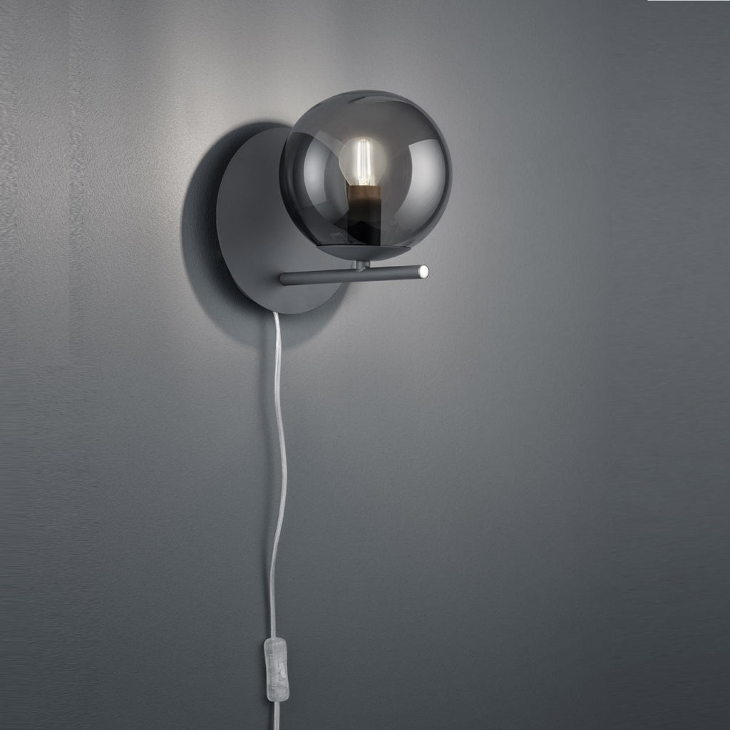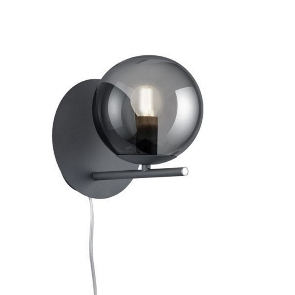 Applique in metallo finitura antracite con diffusore in vetro trasparente fumè. Dimensioni 21 × 21 × 18 cm, attacco E14 (lampadina non inclusa), cavo con interruttore e spina. Ideale per camere, corridoi e soggiorni.