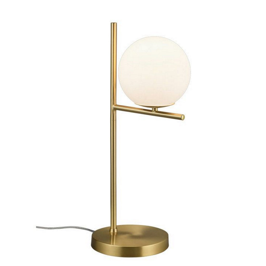 Lume moderno in metallo finitura oro satinato con diffusore in vetro bianco opale. Altezza 52 cm, attacco E14 (lampadina non inclusa). Ideale per comodini, scrivanie e zone living moderne.