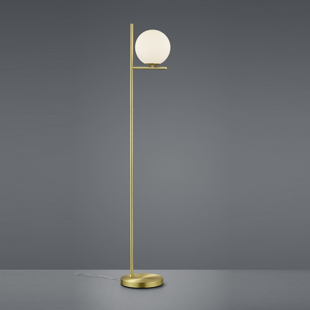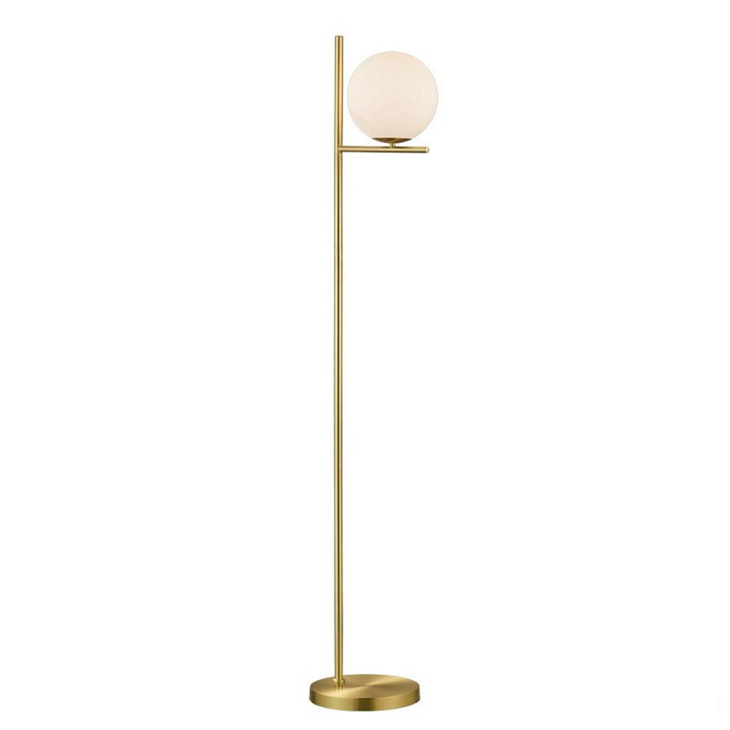 Piantana moderna in metallo finitura oro satinato con diffusori in vetro bianco opale. Altezza 150 cm, attacco E14 (lampadina non inclusa). Ideale per soggiorni, camere e studi.