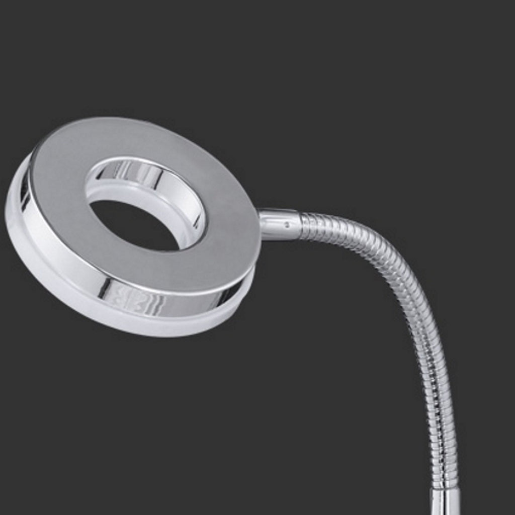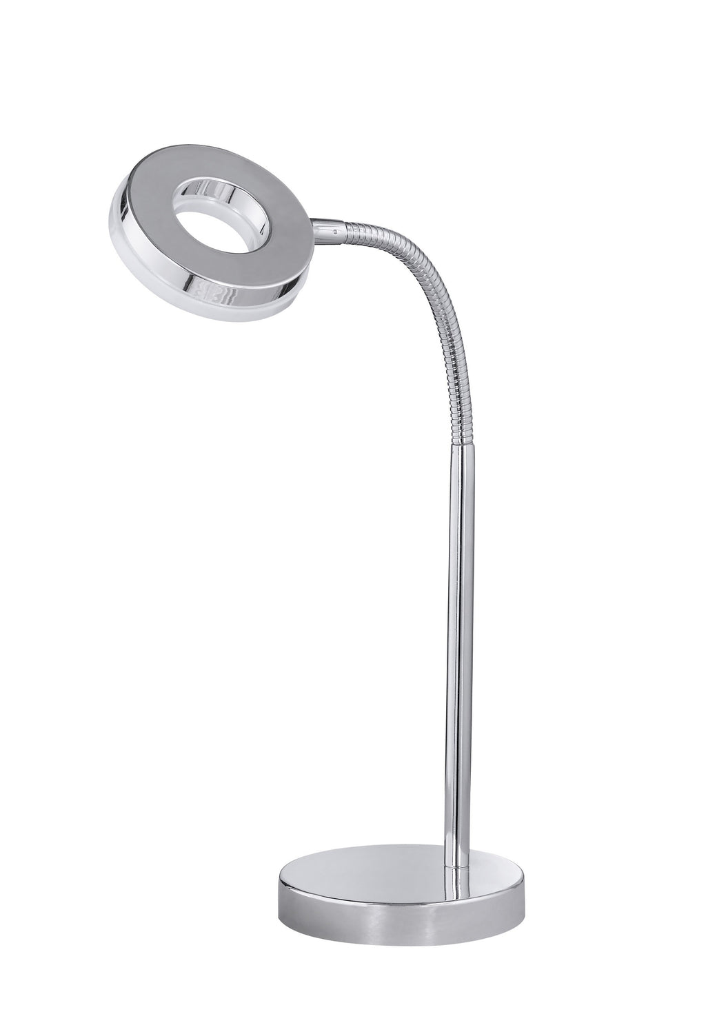 Lampada da scrivania LED Rennes in metallo cromato con braccio flessibile. LED 4W integrato, 350 lumen, luce bianco caldo 3000K, CRI>80. Altezza 40 cm. Design elegante e funzionale, garanzia 5 anni.