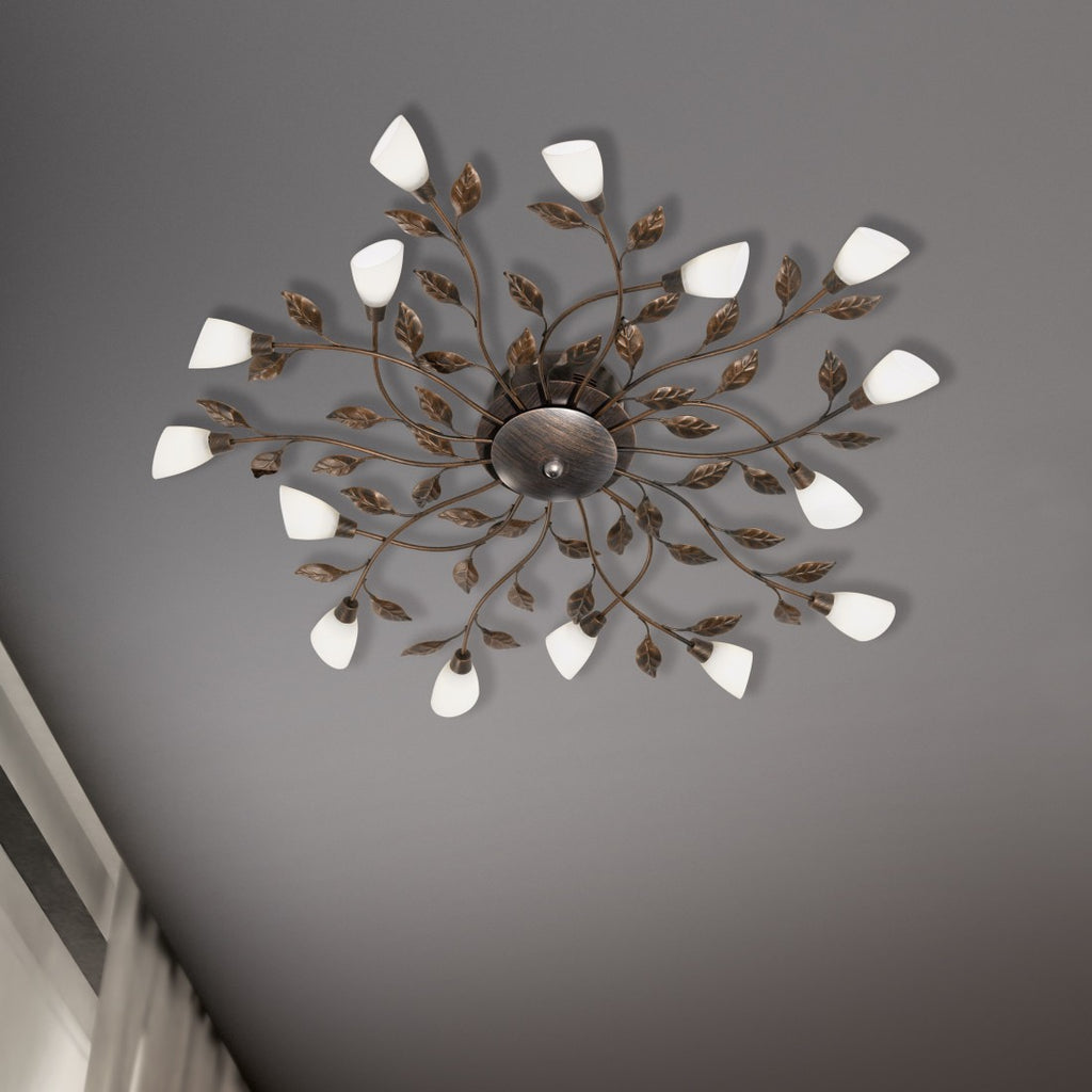 Reposa è una plafoniera di grandi dimensioni, dal diametro di 80cm, in stile rustico / arte povera / stile fiorentino con disegno a foglie in metallo finitura antichizzata color ruggine e vetri bianchi opali.