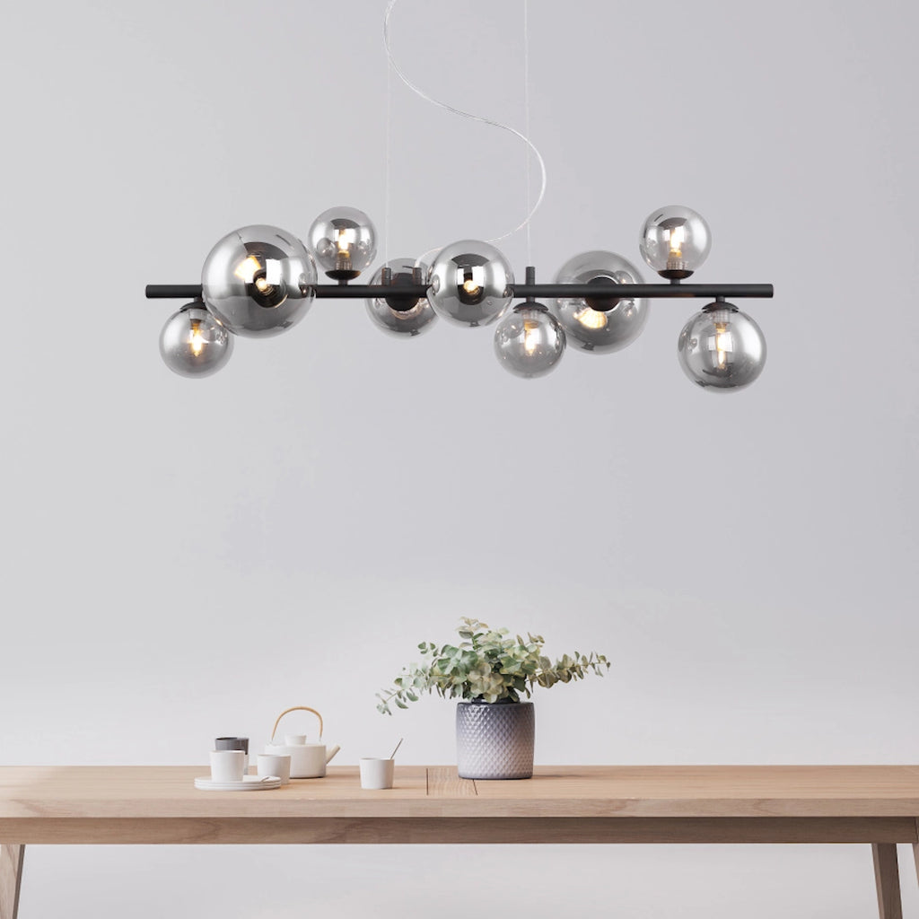 Il lampadario LED Riha 9 luci in metallo nero con sfere in vetro fumè è pensato per chi desidera un unico punto luce scenografico sopra il tavolo o in cucina. La barra lineare da 87 cm con bolle di diverse dimensioni crea un design dinamico e contemporaneo che arreda l’ambiente ancora prima di accendere la luce.