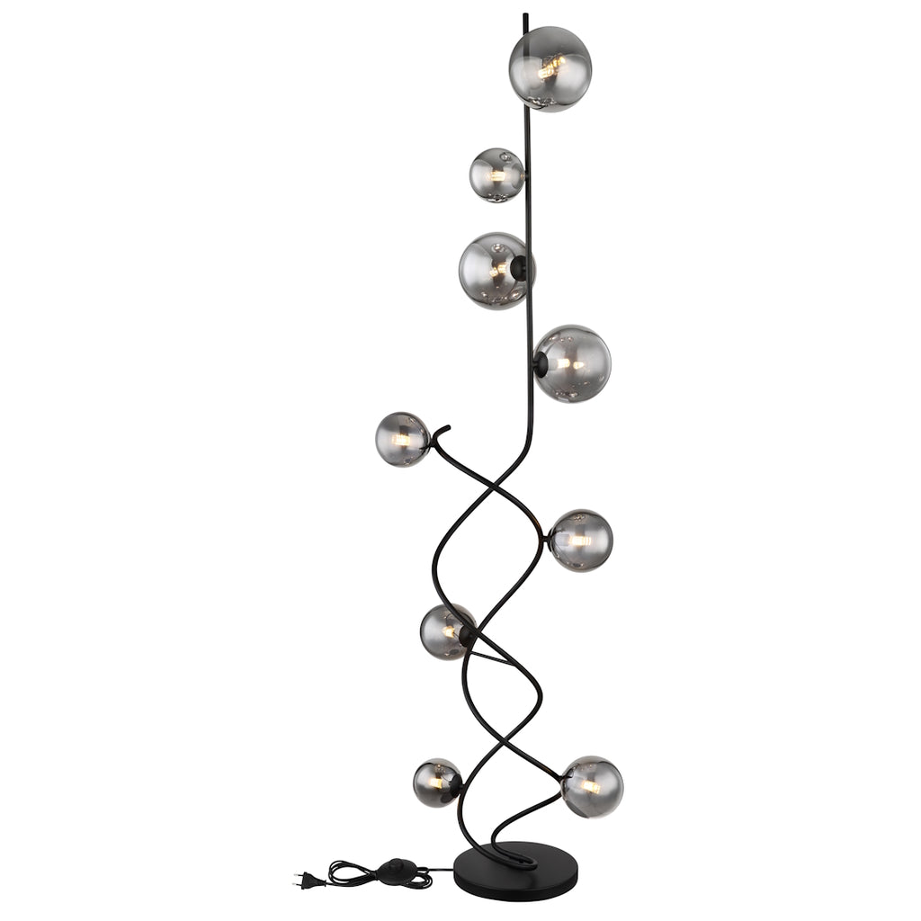Lampada da terra moderna a 9 luci in metallo nero, altezza 162 cm, con sfere in vetro fumè di diverse dimensioni. Completa di lampadine LED attacco G9 incluse e sostituibili, 9×3W per un totale di 3.150 lumen, luce bianco caldo 3000K. Ideale per soggiorni e zone living.